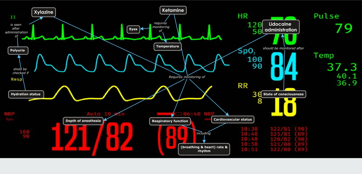 This Concept Map, created with IHMC CmapTools, has information related to: Monitoring, Xylazine Requires monitoring of Depth of anesthesia, Lidocaine administration Requires monitoring of Depth of anesthesia, Ketamine Requires monitoring of Cardiovascular status, Ketamine Requires monitoring of Depth of anesthesia, Ketamine requires monitoring of Temperature, Hydration status shold be checked if Polyuria, Ketamine Requires monitoring of Respiratory function, Xylazine Requires monitoring of Respiratory function, Respiratory function including (breathing & heart) rate & rhythm, Lidocaine administration Requires monitoring of Cardiovascular status, Xylazine Requires monitoring of Cardiovascular status, Lidocaine administration Requires monitoring of Respiratory function, Ketamine requires monitoring of Eyes, State of consciousness should be monitored after Lidocaine administration, Polyuria is seen after administration of Xylazine, Cardiovascular status including (breathing & heart) rate & rhythm