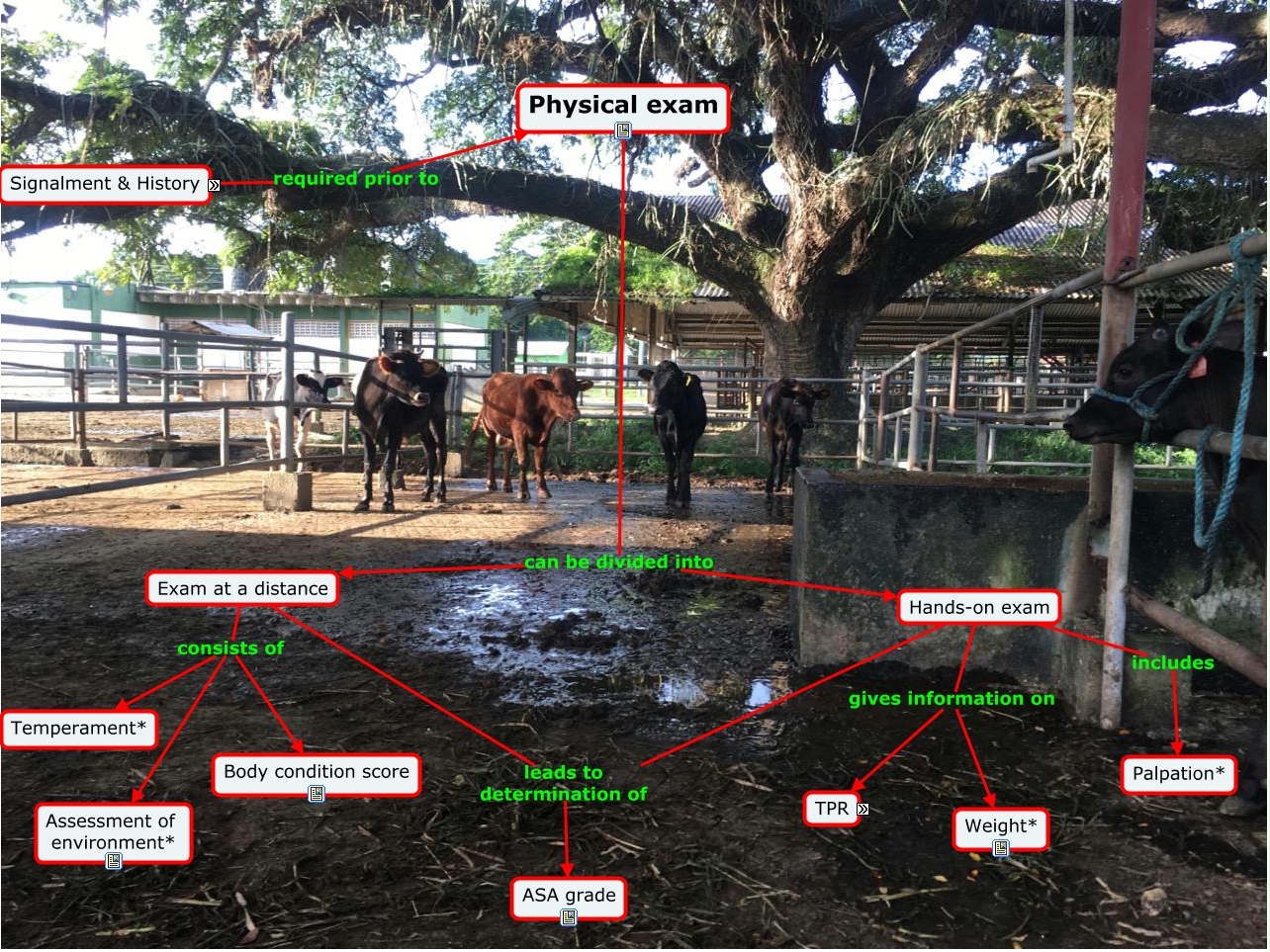 This Concept Map, created with IHMC CmapTools, has information related to: PE, Exam at a distance consists of Body condition score, Exam at a distance leads to determination of ASA grade, Hands-on exam includes Palpation*, Physical exam can be divided into Exam at a distance, Signalment & History required prior to Physical exam, Exam at a distance consists of Temperament*, Hands-on exam leads to determination of ASA grade, Exam at a distance consists of Assessment of environment*, Hands-on exam gives information on TPR, Physical exam can be divided into Hands-on exam, Hands-on exam gives information on Weight*