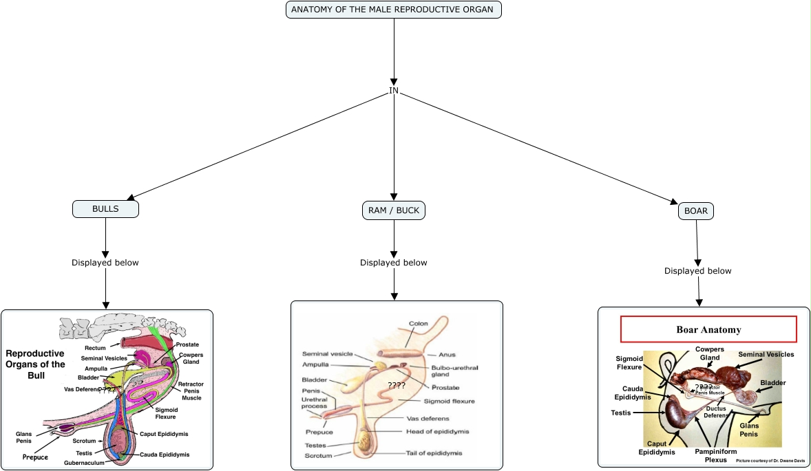This Concept Map, created with IHMC CmapTools, has information related to: Anatomy of the male reproductive organ, BULLS Displayed below ????, RAM / BUCK Displayed below ????, ANATOMY OF THE MALE REPRODUCTIVE ORGAN IN RAM / BUCK, BOAR Displayed below ????, ANATOMY OF THE MALE REPRODUCTIVE ORGAN IN BOAR, ANATOMY OF THE MALE REPRODUCTIVE ORGAN IN BULLS