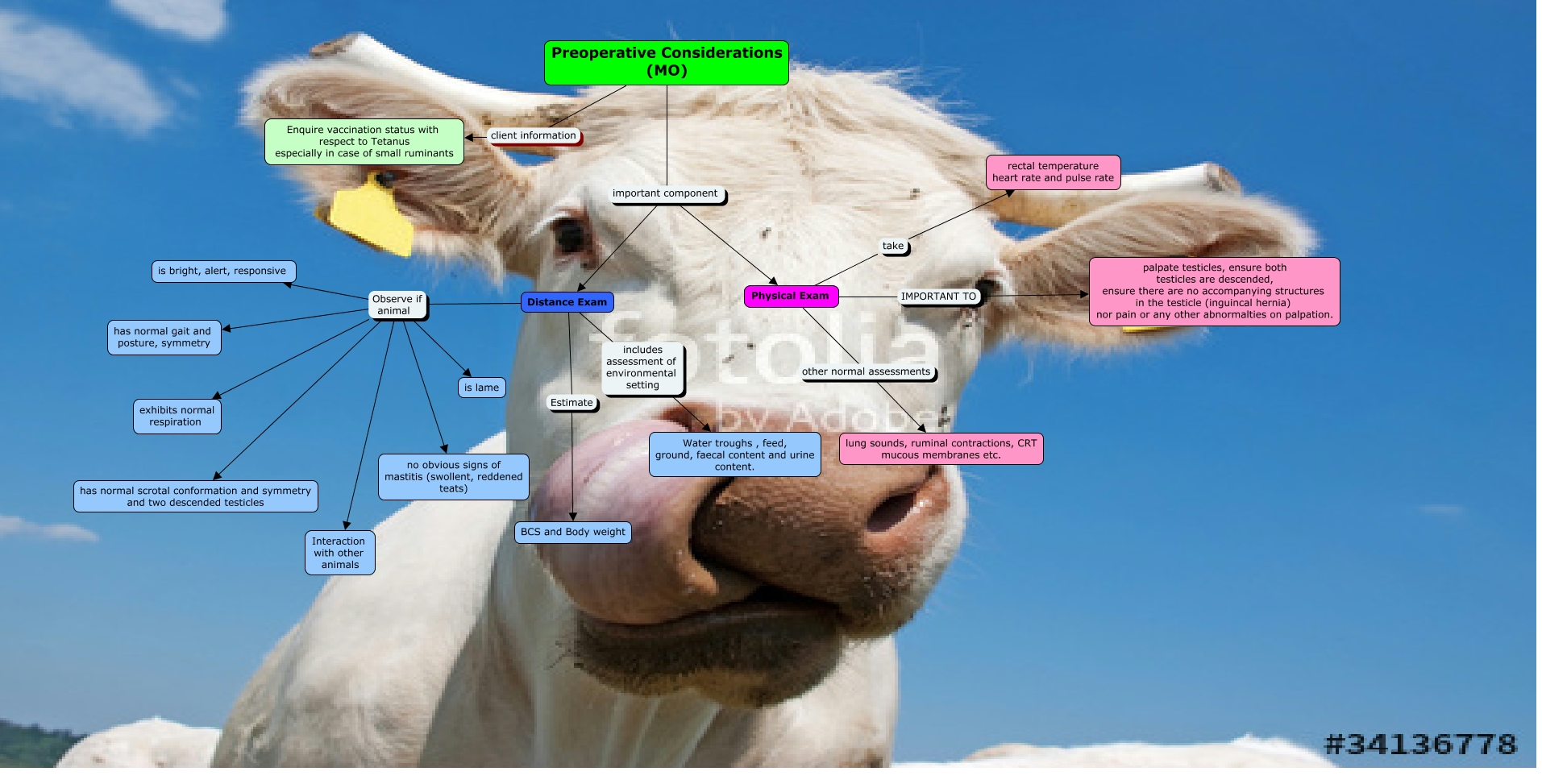 This Concept Map, created with IHMC CmapTools, has information related to: Distance and Physical exam, Distance Exam Observe if animal is bright, alert, responsive, Physical Exam other normal assessments lung sounds, ruminal contractions, CRT mucous membranes etc., Preoperative Considerations (MO) important component Physical Exam, Distance Exam includes assessment of environmental setting Water troughs , feed, ground, faecal content and urine content., Preoperative Considerations (MO) important component Distance Exam, Physical Exam take rectal temperature heart rate and pulse rate, Distance Exam Observe if animal is lame, Distance Exam Observe if animal Interaction with other animals, Distance Exam Estimate BCS and Body weight, Distance Exam Observe if animal no obvious signs of mastitis (swollent, reddened teats), Physical Exam IMPORTANT TO palpate testicles, ensure both testicles are descended, ensure there are no accompanying structures in the testicle (inguincal hernia) nor pain or any other abnormalties on palpation., Distance Exam Observe if animal exhibits normal respiration, Distance Exam Observe if animal has normal gait and posture, symmetry, Preoperative Considerations (MO) client information Enquire vaccination status with respect to Tetanus especially in case of small ruminants, Distance Exam Observe if animal has normal scrotal conformation and symmetry and two descended testicles