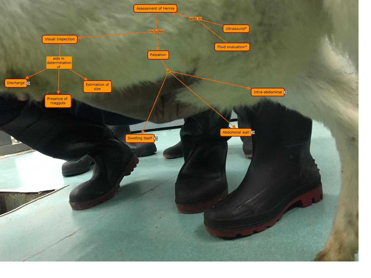 This Concept Map, created with IHMC CmapTools, has information related to: pE2.0, Ultrasound* aids in Assessment of Hernia, Palpation of Abdominal wall, Visual Inspection aids in determination of Discharge, Fluid evaluation* aids in Assessment of Hernia, Is it Reducible/non-reducible*, Visual Inspection aids in determination of Estimation of size, Palpation of Swelling itself, Assessment of Hernia includes Palpation, What is the Temperature*, Visual Inspection aids in determination of Presence of maggots, Assessment of Hernia includes Visual Inspection, Palpation of Intra-abdominal, What is the Consistency*, Is it Painful*