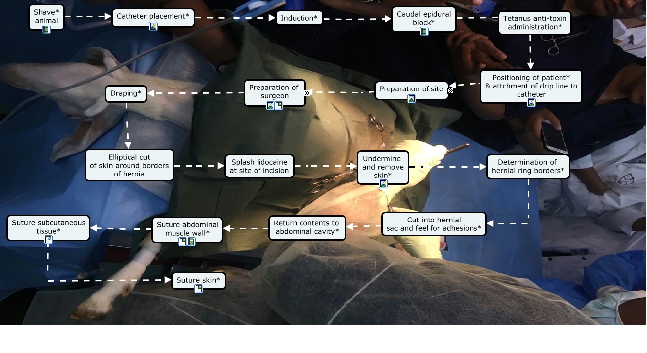 This Concept Map, created with IHMC CmapTools, has information related to: Procedure, Determination of hernial ring borders* Cut into hernial sac and feel for adhesions*, Shave* animal Catheter placement*, Splash lidocaine at site of incision Undermine and remove skin*, Undermine and remove skin* Determination of hernial ring borders*, Suture subcutaneous tissue* Suture skin*, Preparation of surgeon Draping*, Caudal epidural block* Positioning of patient* & attchment of drip line to catheter, Catheter placement* Induction*, Preparation of site Preparation of surgeon, Positioning of patient* & attchment of drip line to catheter Preparation of site, Draping* Elliptical cut of skin around borders of hernia, Induction* Caudal epidural block*, Suture abdominal muscle wall* Suture subcutaneous tissue*, Elliptical cut of skin around borders of hernia Splash lidocaine at site of incision, Return contents to abdominal cavity* Suture abdominal muscle wall*, Cut into hernial sac and feel for adhesions* Return contents to abdominal cavity*