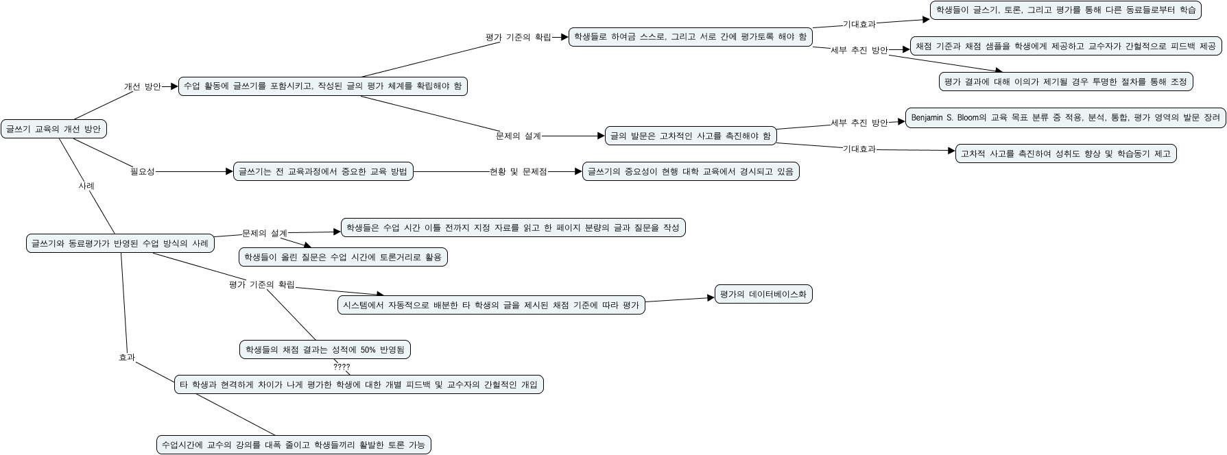 This Concept Map, created with IHMC CmapTools, has information related to: 1번, 학생들의 채점 결과는 성적에 50% 반영됨 ???? 타 학생과 현격하게 차이가 나게 평가한 학생에 대한 개별 피드백 및 교수자의 간헐적인 개입, 글쓰기와 동료평가가 반영된 수업 방식의 사례 평가 기준의 확립 학생들의 채점 결과는 성적에 50% 반영됨, 글쓰기와 동료평가가 반영된 수업 방식의 사례 효과 수업시간에 교수의 강의를 대폭 줄이고 학생들끼리 활발한 토론 가능, 글쓰기와 동료평가가 반영된 수업 방식의 사례 문제의 설계 학생들이 올린 질문은 수업 시간에 토론거리로 활용, 수업 활동에 글쓰기를 포함시키고, 작성된 글의 평가 체계를 확립해야 함 평가 기준의 확립 학생들로 하여금 스스로, 그리고 서로 간에 평가토록 해야 함, 학생들로 하여금 스스로, 그리고 서로 간에 평가토록 해야 함 기대효과 학생들이 글스기, 토론, 그리고 평가를 통해 다른 동료들로부터 학습, 학생들로 하여금 스스로, 그리고 서로 간에 평가토록 해야 함 세부 추진 방안 평가 결과에 대해 이의가 제기될 경우 투명한 절차를 통해 조정, 글의 발문은 고차적인 사고를 촉진해야 함 세부 추진 방안 Benjamin S. Bloom의 교육 목표 분류 중 적용, 분석, 통합, 평가 영역의 발문 장려, 시스템에서 자동적으로 배분한 타 학생의 글을 제시된 채점 기준에 따라 평가 ???? 평가의 데이터베이스화, 학생들로 하여금 스스로, 그리고 서로 간에 평가토록 해야 함 세부 추진 방안 채점 기준과 채점 샘플을 학생에게 제공하고 교수자가 간헐적으로 피드백 제공, 글쓰기와 동료평가가 반영된 수업 방식의 사례 평가 기준의 확립 시스템에서 자동적으로 배분한 타 학생의 글을 제시된 채점 기준에 따라 평가, 글쓰기와 동료평가가 반영된 수업 방식의 사례 문제의 설계 학생들은 수업 시간 이틀 전까지 지정 자료를 읽고 한 페이지 분량의 글과 질문을 작성, 글쓰기 교육의 개선 방안 사례 글쓰기와 동료평가가 반영된 수업 방식의 사례, 글쓰기는 전 교육과정에서 중요한 교육 방법 현황 및 문제점 글쓰기의 중요성이 현행 대학 교육에서 경시되고 있음, 글의 발문은 고차적인 사고를 촉진해야 함 기대효과 고차적 사고를 촉진하여 성취도 향상 및 학습동기 제고, 글쓰기 교육의 개선 방안 필요성 글쓰기는 전 교육과정에서 중요한 교육 방법, 수업 활동에 글쓰기를 포함시키고, 작성된 글의 평가 체계를 확립해야 함 문제의 설계 글의 발문은 고차적인 사고를 촉진해야 함, 글쓰기 교육의 개선 방안 개선 방안 수업 활동에 글쓰기를 포함시키고, 작성된 글의 평가 체계를 확립해야 함