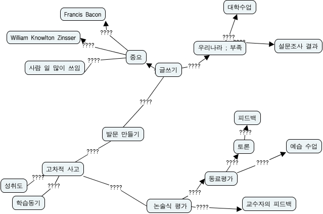 This Concept Map, created with IHMC CmapTools, has information related to: 2번_1, 우리나라 ; 부족 ???? 대학수업, 토론 ???? 피드백, 글쓰기 ???? 우리나라 ; 부족, 발문 만들기 ???? 고차적 사고, 중요 ???? William Knowlton Zinsser, 고차적 사고 ???? ????, 중요 ???? Francis Bacon, 동료평가 ???? 예습 수업, 중요 ???? 사람 일 많이 쓰임, 고차적 사고 ???? 성취도, 우리나라 ; 부족 ???? 설문조사 결과, 동료평가 ???? 토론, 고차적 사고 ???? 논술식 평가, 글쓰기 ???? 발문 만들기, 논술식 평가 ???? 교수자의 피드백, 논술식 평가 ???? 동료평가, 글쓰기 ???? 중요