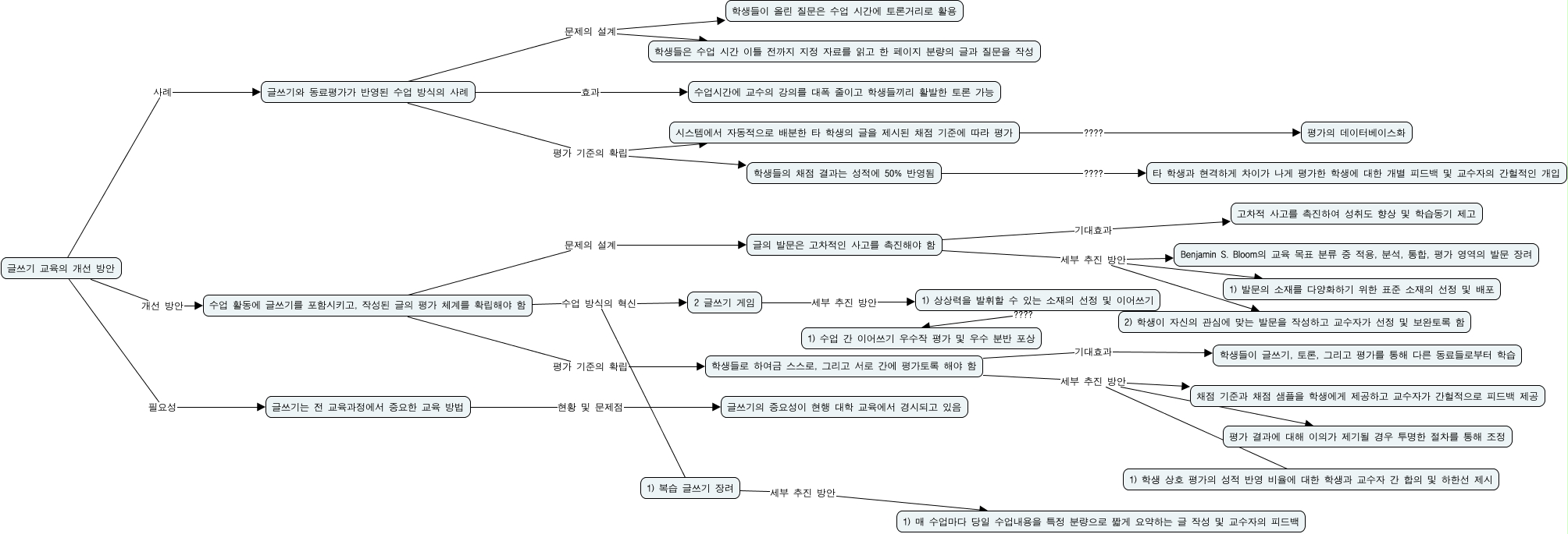 This Concept Map, created with IHMC CmapTools, has information related to: 1015, 수업 활동에 글쓰기를 포함시키고, 작성된 글의 평가 체계를 확립해야 함 수업 방식의 혁신 2 글쓰기 게임, 글의 발문은 고차적인 사고를 촉진해야 함 세부 추진 방안 Benjamin S. Bloom의 교육 목표 분류 중 적용, 분석, 통합, 평가 영역의 발문 장려, 학생들로 하여금 스스로, 그리고 서로 간에 평가토록 해야 함 세부 추진 방안 채점 기준과 채점 샘플을 학생에게 제공하고 교수자가 간헐적으로 피드백 제공, 학생들의 채점 결과는 성적에 50% 반영됨 ???? 타 학생과 현격하게 차이가 나게 평가한 학생에 대한 개별 피드백 및 교수자의 간헐적인 개입, 수업 활동에 글쓰기를 포함시키고, 작성된 글의 평가 체계를 확립해야 함 문제의 설계 글의 발문은 고차적인 사고를 촉진해야 함, 수업 활동에 글쓰기를 포함시키고, 작성된 글의 평가 체계를 확립해야 함 수업 방식의 혁신 1) 복습 글쓰기 장려, 글쓰기 교육의 개선 방안 사례 글쓰기와 동료평가가 반영된 수업 방식의 사례, 글쓰기와 동료평가가 반영된 수업 방식의 사례 평가 기준의 확립 시스템에서 자동적으로 배분한 타 학생의 글을 제시된 채점 기준에 따라 평가, 학생들로 하여금 스스로, 그리고 서로 간에 평가토록 해야 함 기대효과 학생들이 글쓰기, 토론, 그리고 평가를 통해 다른 동료들로부터 학습, 시스템에서 자동적으로 배분한 타 학생의 글을 제시된 채점 기준에 따라 평가 ???? 평가의 데이터베이스화, 학생들로 하여금 스스로, 그리고 서로 간에 평가토록 해야 함 세부 추진 방안 평가 결과에 대해 이의가 제기될 경우 투명한 절차를 통해 조정, 학생들로 하여금 스스로, 그리고 서로 간에 평가토록 해야 함 세부 추진 방안 1) 학생 상호 평가의 성적 반영 비율에 대한 학생과 교수자 간 합의 및 하한선 제시, 글의 발문은 고차적인 사고를 촉진해야 함 세부 추진 방안 1) 발문의 소재를 다양화하기 위한 표준 소재의 선정 및 배포, 글쓰기와 동료평가가 반영된 수업 방식의 사례 평가 기준의 확립 학생들의 채점 결과는 성적에 50% 반영됨, 글쓰기와 동료평가가 반영된 수업 방식의 사례 문제의 설계 학생들이 올린 질문은 수업 시간에 토론거리로 활용, 2 글쓰기 게임 세부 추진 방안 1) 상상력을 발휘할 수 있는 소재의 선정 및 이어쓰기, 글쓰기 교육의 개선 방안 개선 방안 수업 활동에 글쓰기를 포함시키고, 작성된 글의 평가 체계를 확립해야 함, 수업 활동에 글쓰기를 포함시키고, 작성된 글의 평가 체계를 확립해야 함 평가 기준의 확립 학생들로 하여금 스스로, 그리고 서로 간에 평가토록 해야 함, 글의 발문은 고차적인 사고를 촉진해야 함 세부 추진 방안 2) 학생이 자신의 관심에 맞는 발문을 작성하고 교수자가 선정 및 보완토록 함, 1) 복습 글쓰기 장려 세부 추진 방안 1) 매 수업마다 당일 수업내용을 특정 분량으로 짧게 요약하는 글 작성 및 교수자의 피드백
