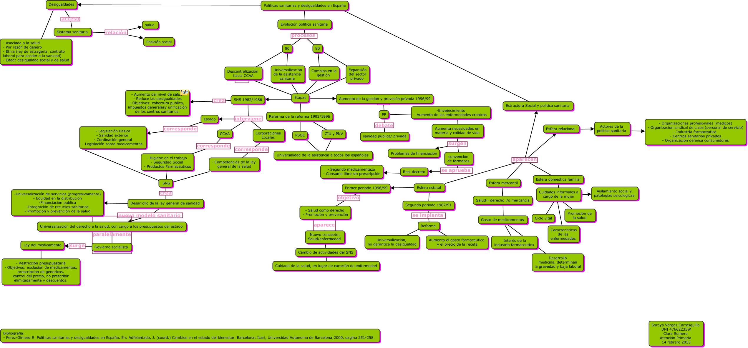 Este Cmap, tiene información relacionada con: politicas sanitaias, Nuevo concepto: Salud/enfermedad ???? Cambio de actividades del SNS, Cuidados informales a cargo de la mujer ???? Promoción de la salud, Etapas ???? Reforma de la reforma 1992/1996, CCAA corresponde - Higiene en el trabajo - Seguridad Social - Productos Farmaceuticos, Políticas sanitarias y desigualdades en España ???? Desigualdades, Esfera estatal ???? Primer periodo 1996/99, Govierno socialista surge Ley del medicamento, 90 ???? Expansión del sector privado, Reforma de la reforma 1992/1996 ???? CIU y PNV, 80 ???? Universalización de la asistencia sanitaria, CIU y PNV ???? Universalidad de la asistencia a todos los españoles, Universalización del derecho a la salud, con cargo a los presupuestos del estado paralelamente Govierno socialista, Expansión del sector privado ???? Etapas, Segundo periodo 1987/91 se implanta Reforma, subvención de farmacos se aprueba Real decreto, Esfera domestica familiar ???? Cuidados informales a cargo de la mujer, Real decreto es - Segundo medicamentazo - Consumo libre sin prescripción, PP ???? -Envejecimiento - Aumento de las enfermedades cronicas, Esfera estatal ???? Segundo periodo 1987/91, SNS 1982/1986 interviene CCAA