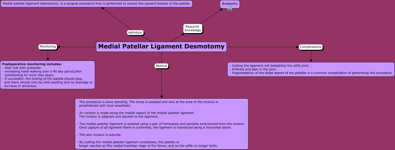 This Concept Map, created with IHMC CmapTools, has information related to: Medial Patellar Ligament Desmotomy, Medial Patellar Ligament Desmotomy Required Knowledge Anatomy, Medial Patellar Ligament Desmotomy Monitoring Postoperative monitoring includes: - Stall rest with gradually - increasing hand walking over a 90 day period,then conditioning for work may begin. - If successful, the locking of the patella should stop, and there should only be mild swelling and no drainage or increase in lameness., Medial Patellar Ligament Desmotomy definition Medial patellar ligament desmotomy, is a surgical procedure that is performed to correct the upward fixation of the patella., Medial Patellar Ligament Desmotomy Method - The procedure is done standing. The horse is sedated and skin at the area of the incision is anesthetized with local anesthetic. - An incision is made along the medial aspect of the medial patellar ligament. The incision is adjacent and parallel to the ligament. - The medial patellar ligament is isolated using a pair of hemostats and partially exteriorized from the incision. Once capture of all ligament fibers is confirmed, the ligament is transected along a horizontal plane. - The skin incision is sutured. - By cutting the medial patellar ligament completely, the patella no longer catches on the medial trochlear ridge of the femur, and so the stifle no longer locks., Medial Patellar Ligament Desmotomy Complications - Cutting the ligament will destabilize the stifle joint. - Arthritis and pain in the joint. - Fragmentation of the distal aspect of the patellar is a common complication of performing this procedure.