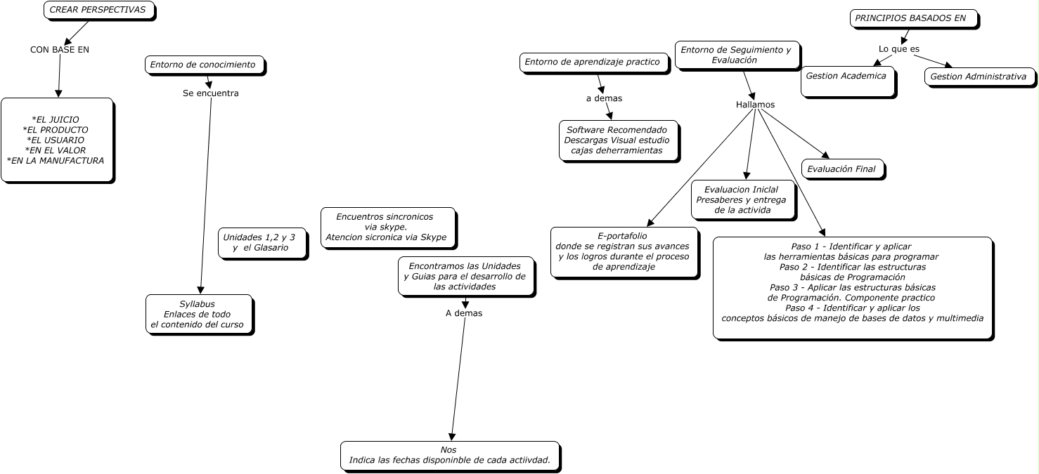 Este Cmap, tiene información relacionada con: CALIDAD TOTAL, CREAR PERSPECTIVAS CON BASE EN *EL JUICIO *EL PRODUCTO *EL USUARIO *EN EL VALOR *EN LA MANUFACTURA, Entorno de Seguimiento y Evaluación Hallamos Paso 1 - Identificar y aplicar las herramientas básicas para programar Paso 2 - Identificar las estructuras básicas de Programación Paso 3 - Aplicar las estructuras básicas de Programación. Componente practico Paso 4 - Identificar y aplicar los conceptos básicos de manejo de bases de datos y multimedia, Entorno de Seguimiento y Evaluación Hallamos E-portafolio donde se registran sus avances y los logros durante el proceso de aprendizaje, Encontramos las Unidades y Guias para el desarrollo de las actividades A demas Nos Indica las fechas disponinble de cada actiivdad., Entorno de Seguimiento y Evaluación Hallamos Evaluación Final, PRINCIPIOS BASADOS EN Lo que es Gestion Administrativa, Entorno de Seguimiento y Evaluación Hallamos Evaluacion Iniclal Presaberes y entrega de la activida, PRINCIPIOS BASADOS EN Lo que es Gestion Academica, Entorno de aprendizaje practico a demas Software Recomendado Descargas Visual estudio cajas deherramientas, Entorno de conocimiento Se encuentra Syllabus Enlaces de todo el contenido del curso
