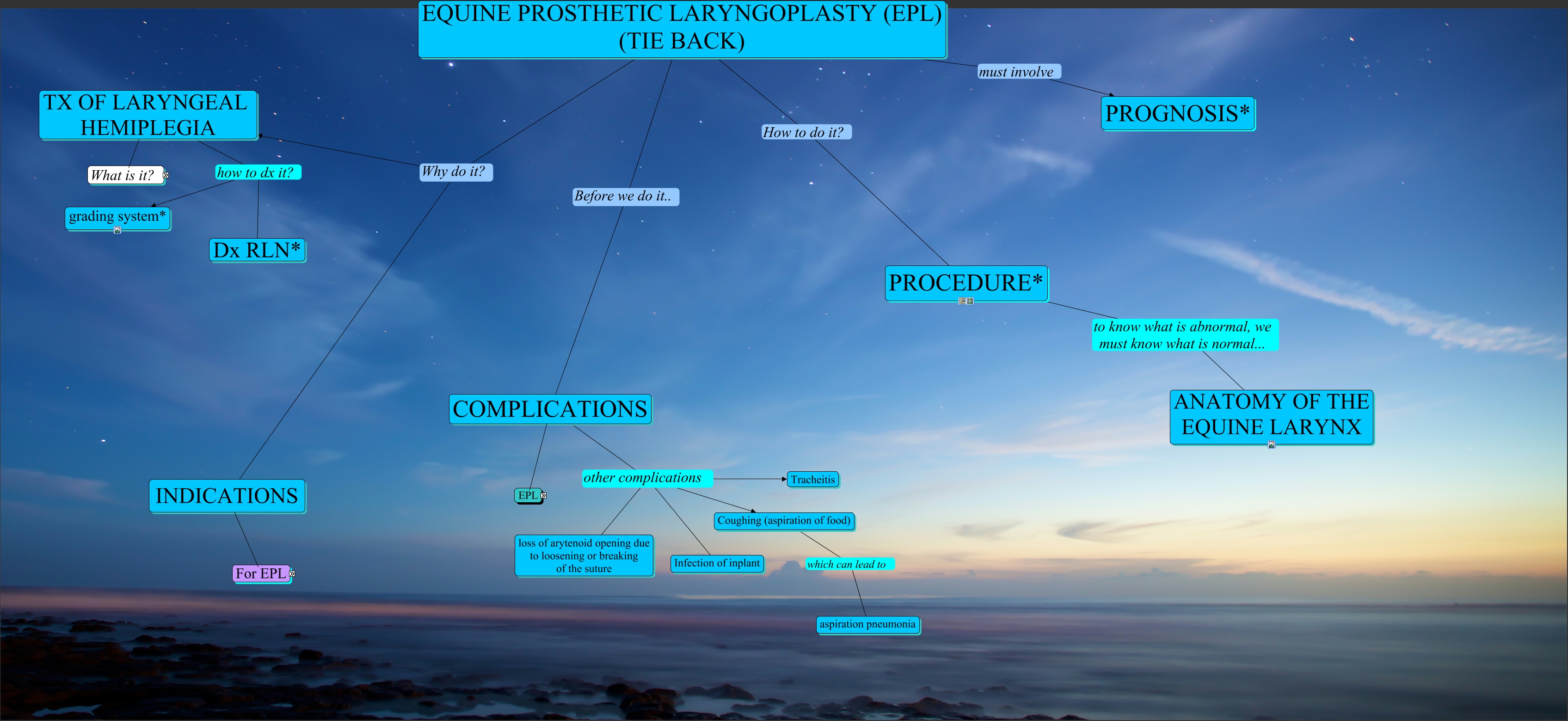 This Concept Map, created with IHMC CmapTools, has information related to: Prosthetic laryngoplasty - horse, TX OF LARYNGEAL HEMIPLEGIA how to dx it? grading system*, COMPLICATIONS other complications Tracheitis, Coughing (aspiration of food) which can lead to aspiration pneumonia, increase in inflammatory airway disease (IAD)* can lead to interruption of training, COMPLICATIONS other complications loss of arytenoid opening due to loosening or breaking of the suture, EQUINE PROSTHETIC LARYNGOPLASTY (EPL) (TIE BACK) Why do it? TX OF LARYNGEAL HEMIPLEGIA, TX OF LARYNGEAL HEMIPLEGIA how to dx it? Dx RLN*, Left-sided laryngeal hemiplegia* after surgery, there is enough airflow to the horse to perform its intended use w/o complications, COMPLICATIONS EPL increase in inflammatory airway disease (IAD)*, TX OF LARYNGEAL HEMIPLEGIA what is it/how does it occur? unilateral paralysis of the arytenoid cartilage, EQUINE PROSTHETIC LARYNGOPLASTY (EPL) (TIE BACK) Before we do it.. COMPLICATIONS, INDICATIONS for EPL maintenance of a stable glottis, COMPLICATIONS EPL increase in exercise- induced pulmonary haemorrage (EIPH)*, PROCEDURE* to know what is abnormal, we must know what is normal... ANATOMY OF THE EQUINE LARYNX, COMPLICATIONS EPL Does not produce a completely normal airway, Left-sided laryngeal hemiplegia* another tx ventriculocordectomy (removal of vocal cords), increase in exercise- induced pulmonary haemorrage (EIPH)* can lead to early retirement of the horse*, maintenance of a stable glottis example: as a tx of Left-sided laryngeal hemiplegia*, COMPLICATIONS other complications Infection of inplant, increase in inflammatory airway disease (IAD)* can lead to impaired performance