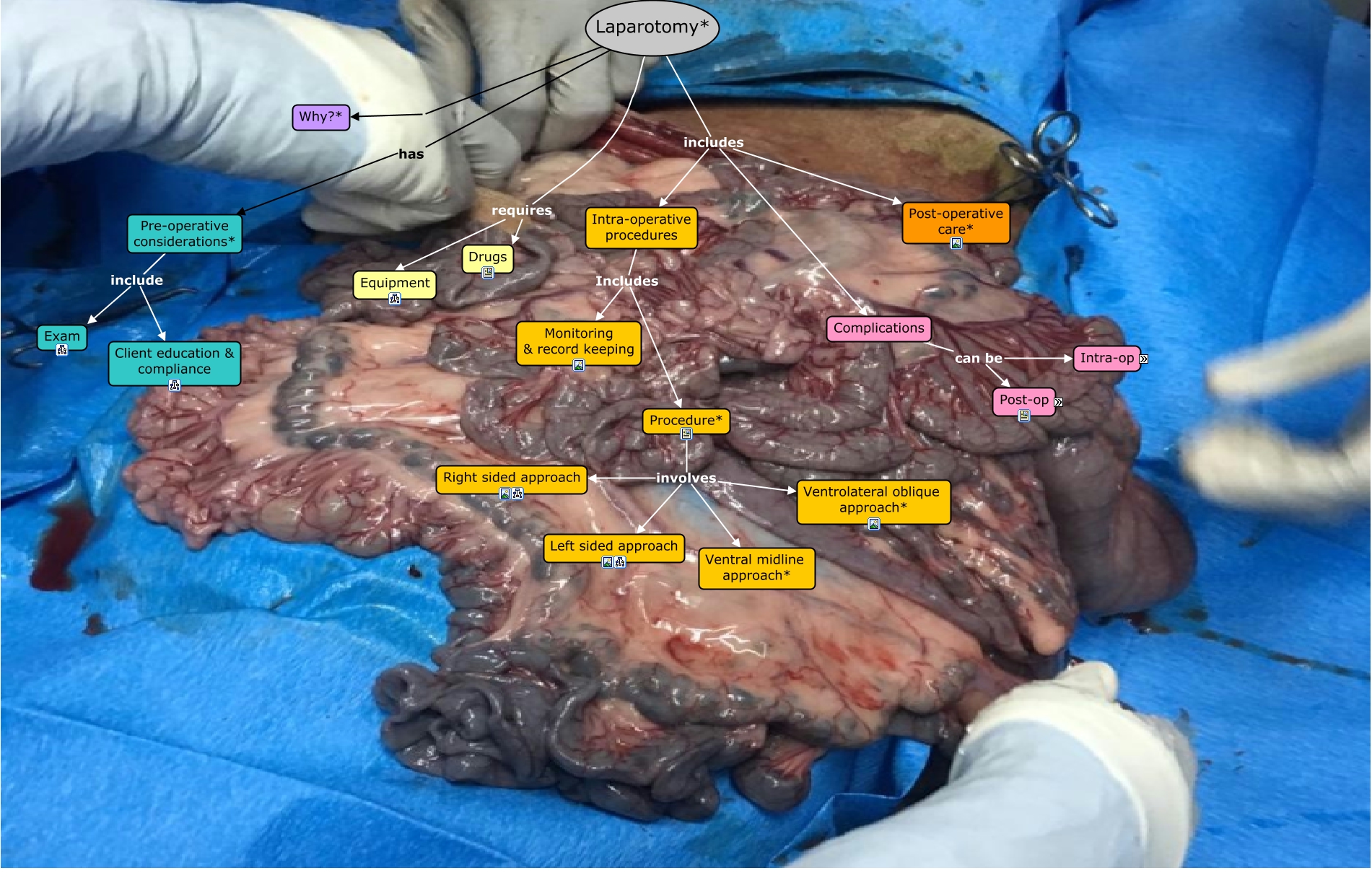 This Concept Map, created with IHMC CmapTools, has information related to: Lab 9, Pre-operative considerations* include Exam, Complications can be Intra-op, Laparotomy* includes Complications, Intra-operative procedures Includes Monitoring & record keeping, Adverse reaction to anesthetic agents* corrected by Reversal*, Intra-operative procedures Includes Procedure*, Pre-operative considerations* include Client education & compliance, Laparotomy* includes Post-operative care*, Procedure* involves Right sided approach, Laparotomy* includes Intra-operative procedures, Laparotomy* requires Drugs, Laparotomy* requires Equipment, Procedure* involves Ventral midline approach*, Adverse reaction to anesthetic agents* corrected by REFUSAL TO PERFORM SURGERY*, Complications can be Post-op, Procedure* involves Ventrolateral oblique approach*, Laparotomy* has Pre-operative considerations*, Bloat corrected by passing of stomach tube into rumen, Procedure* involves Left sided approach, Laparotomy* Why?*