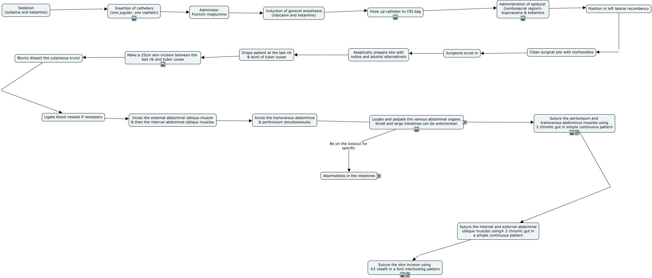 This Concept Map, created with IHMC CmapTools, has information related to: procedure, Suture the internal and external abdominal oblique muscles using# 2 chromic gut in a simple continuous pattern Suture the skin incision using #2 vetafil in a ford interlocking pattern, Induction of general anesthesia (lidocaine and ketamine) Hook up catheter to CRI bag, Incise the external abdominal oblique muscle & then the internal abdominal oblique muscles Incise the transversus abdominus & peritoneum simultaneously, Incise the transversus abdominus & peritoneum simultaneously Locate and palpate the various abdominal organs. Small and large intestines can be exteriorised., Insertion of catheters (one jugular, one cephalic) Administer Flunixin meglumine, Suture the peritoneum and transversus abdominus muscles using 2 chromic gut in simple continuous pattern Suture the internal and external abdominal oblique muscles using# 2 chromic gut in a simple continuous pattern, Locate and palpate the various abdominal organs. Small and large intestines can be exteriorised. Be on the lookout for specific Abormalities in the intestines, Reticulum* Ventral peritoneum*, Administration of epidural (lumbosacral region)- bupivacaine & ketamine Position in left lateral recumbency, Clean surgical site with clorhexidine Surgeons scrub in, Sedation (xylazine and ketamine) Insertion of catheters (one jugular, one cephalic), Ligate blood vessels if necessary Incise the external abdominal oblique muscle & then the internal abdominal oblique muscles, Hook up catheter to CRI bag Administration of epidural (lumbosacral region)- bupivacaine & ketamine, gallbladder* Diaphragm*, Ventral peritoneum* Left kidney*, Make a 25cm skin incision between the last rib and tuber coxae Blunty dissect the cutaneous trunci, Drape patient at the last rib & level of tuber coxae Make a 25cm skin incision between the last rib and tuber coxae, Locate and palpate the various abdominal organs. Small and large intestines can be exteriorised. Suture the peritoneum and transversus abdominus muscles using 2 chromic gut in simple continuous pattern, Left kidney* Omasum*, Right kidney* Liver*