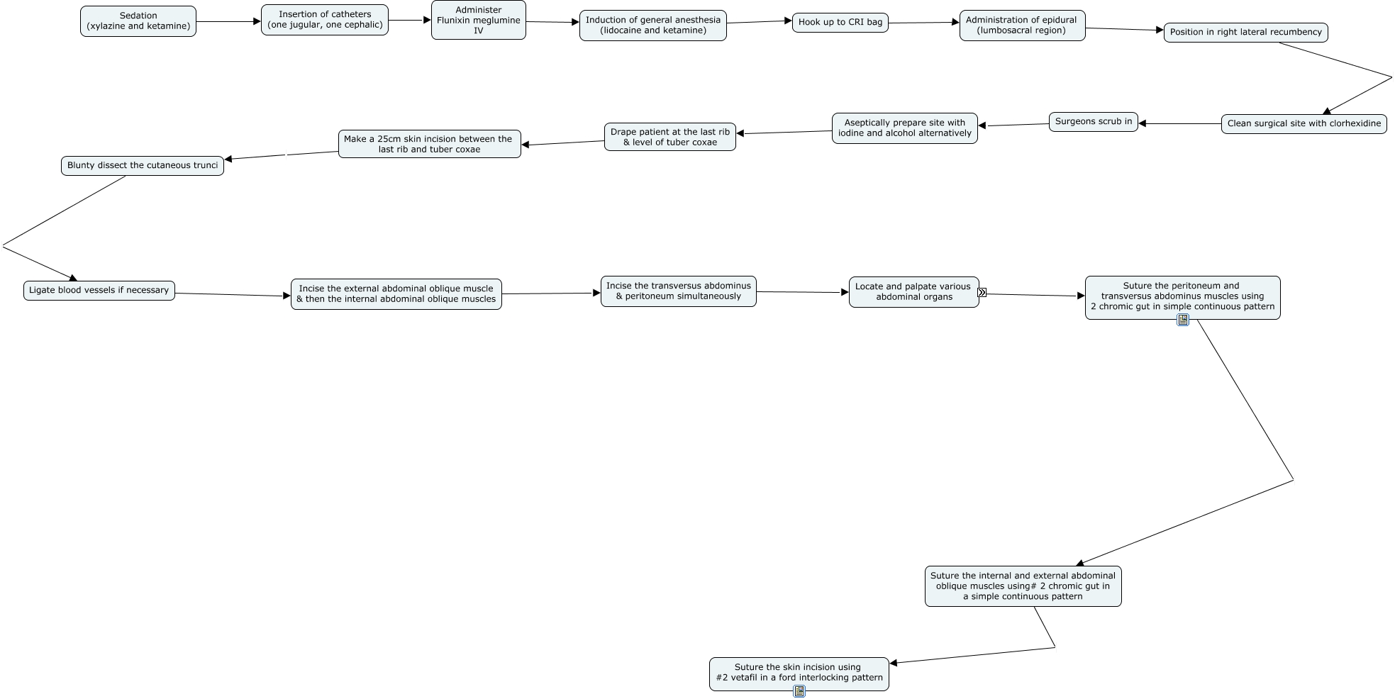 This Concept Map, created with IHMC CmapTools, has information related to: Left paralumbar approach, Induction of general anesthesia (lidocaine and ketamine) Hook up to CRI bag, Hook up to CRI bag Administration of epidural (lumbosacral region), Suture the internal and external abdominal oblique muscles using# 2 chromic gut in a simple continuous pattern Suture the skin incision using #2 vetafil in a ford interlocking pattern, Ligate blood vessels if necessary Incise the external abdominal oblique muscle & then the internal abdominal oblique muscles, Aseptically prepare site with iodine and alcohol alternatively Drape patient at the last rib & level of tuber coxae, Position in right lateral recumbency Clean surgical site with clorhexidine, left displaced abomasum visible; palpate for adhesions Spleen*, Administration of epidural (lumbosacral region) Position in right lateral recumbency, Locate and palpate various abdominal organs Suture the peritoneum and transversus abdominus muscles using 2 chromic gut in simple continuous pattern, Clean surgical site with clorhexidine Surgeons scrub in, Drape patient at the last rib & level of tuber coxae Make a 25cm skin incision between the last rib and tuber coxae, Surgeons scrub in Aseptically prepare site with iodine and alcohol alternatively, Rumen Spleen*, Incise the transversus abdominus & peritoneum simultaneously Locate and palpate various abdominal organs, Sedation (xylazine and ketamine) Insertion of catheters (one jugular, one cephalic), Insertion of catheters (one jugular, one cephalic) Administer Flunixin meglumine IV, Incise the external abdominal oblique muscle & then the internal abdominal oblique muscles Incise the transversus abdominus & peritoneum simultaneously, Spleen* Diaphragm*, Suture the peritoneum and transversus abdominus muscles using 2 chromic gut in simple continuous pattern Suture the internal and external abdominal oblique muscles using# 2 chromic gut in a simple continuous pattern, Rumen Omasum*