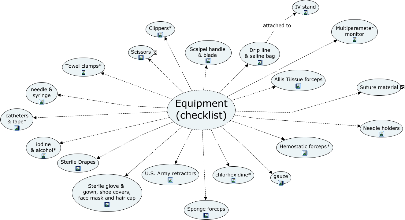 This Concept Map, created with IHMC CmapTools, has information related to: Equipment, Equipment (checklist) Scissors, Equipment (checklist) Needle holders, Equipment (checklist) Clippers*, Equipment (checklist) Scalpel handle & blade, Drip line & saline bag attached to IV stand, Equipment (checklist) Hemostatic forceps*, Equipment (checklist) catheters & tape*, Equipment (checklist) Multiparameter monitor, Equipment (checklist) iodine & alcohol*, Equipment (checklist) gauze, Equipment (checklist) Allis Tiissue forceps, Equipment (checklist) Sponge forceps, Equipment (checklist) Sterile glove & gown, shoe covers, face mask and hair cap, Equipment (checklist) U.S. Army retractors, Equipment (checklist) Drip line & saline bag, Equipment (checklist) needle & syringe, Equipment (checklist) Sterile Drapes, Equipment (checklist) Suture material, Equipment (checklist) Towel clamps*, Equipment (checklist) chlorhexidine*
