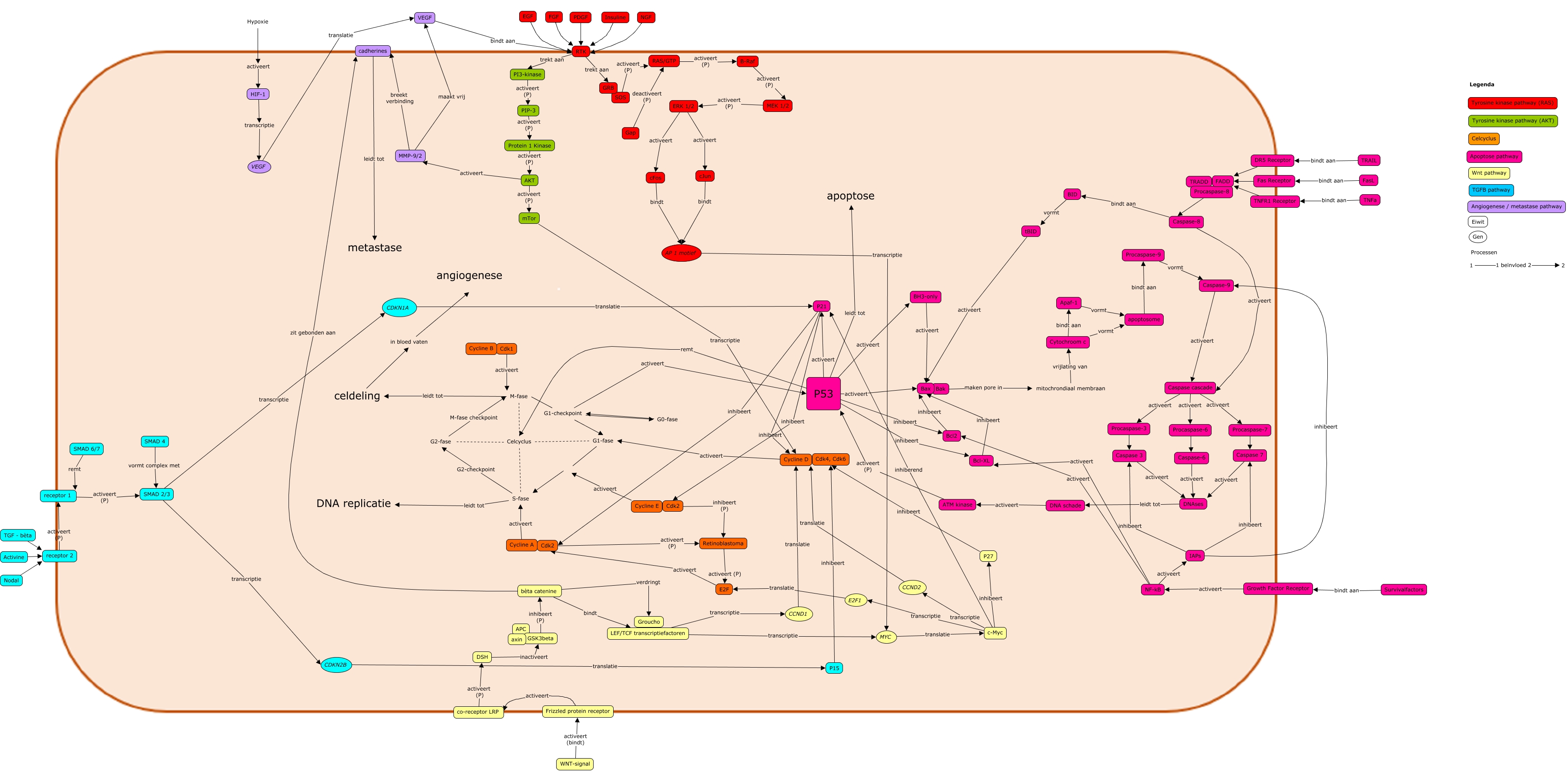 Deze Concept Map heeft informatie gerelateerd aan: Zonder titel 4, M-fase leidt tot celdeling, receptor 1 activeert (P) SMAD 2/3, Bcl-XL inhibeert Bax, P53 activeert P21, Caspase 3 activeert DNAses, Celcyclus S-fase, cadherines leidt tot metastase, Growth Factor Receptor activeert NF-kB, mTor transcriptie Cycline D, AKT activeert MMP-9/2, Bak maken pore in mitochrondiaal membraan, Nodal receptor 2, GSK3beta inhibeert (P) bèta catenine, NF-kB activeert Bcl-XL, DR5 Receptor FADD, c-Myc transcriptie E2F1, AKT activeert (P) mTor, Fas Receptor FADD, EGF RTK, celdeling in bloed vaten