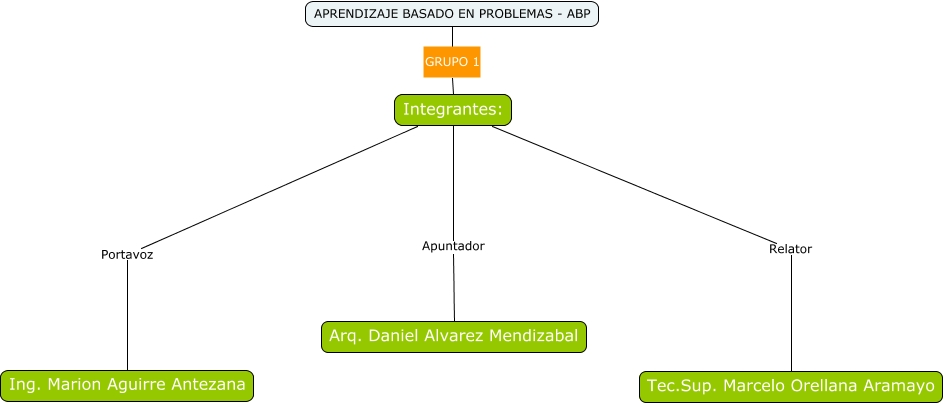 Este Cmap, tiene información relacionada con: ABP -Integrantes de Grupo 1, Integrantes: Relator Tec.Sup. Marcelo Orellana Aramayo, Integrantes: Apuntador Arq. Daniel Alvarez Mendizabal, Integrantes: Portavoz Ing. Marion Aguirre Antezana