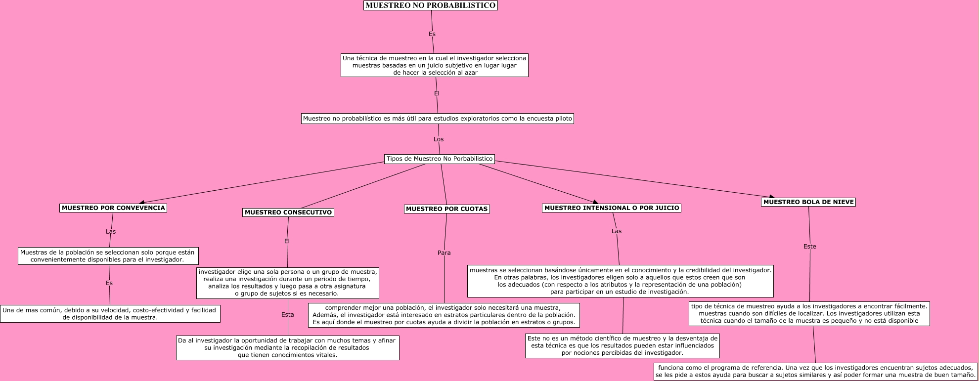 Este Cmap, tiene información relacionada con: INVESTIGACIÓN, MUESTREO BOLA DE NIEVE Este tipo de técnica de muestreo ayuda a los investigadores a encontrar fácilmente. muestras cuando son difíciles de localizar. Los investigadores utilizan esta técnica cuando el tamaño de la muestra es pequeño y no está disponible, muestras se seleccionan basándose únicamente en el conocimiento y la credibilidad del investigador. En otras palabras, los investigadores eligen solo a aquellos que estos creen que son los adecuados (con respecto a los atributos y la representación de una población) para participar en un estudio de investigación. ???? Este no es un método científico de muestreo y la desventaja de esta técnica es que los resultados pueden estar influenciados por nociones percibidas del investigador., tipo de técnica de muestreo ayuda a los investigadores a encontrar fácilmente. muestras cuando son difíciles de localizar. Los investigadores utilizan esta técnica cuando el tamaño de la muestra es pequeño y no está disponible ???? funciona como el programa de referencia. Una vez que los investigadores encuentran sujetos adecuados, se les pide a estos ayuda para buscar a sujetos similares y así poder formar una muestra de buen tamaño., MUESTREO POR CONVEVENCIA Las Muestras de la población se seleccionan solo porque están convenientemente disponibles para el investigador., Tipos de Muestreo No Porbabilistico ???? MUESTREO POR CUOTAS, Tipos de Muestreo No Porbabilistico ???? MUESTREO INTENSIONAL O POR JUICIO, Muestreo no probabilístico es más útil para estudios exploratorios como la encuesta piloto Los Tipos de Muestreo No Porbabilistico, MUESTREO INTENSIONAL O POR JUICIO Las muestras se seleccionan basándose únicamente en el conocimiento y la credibilidad del investigador. En otras palabras, los investigadores eligen solo a aquellos que estos creen que son los adecuados (con respecto a los atributos y la representación de una población) para participar en un estudio de investigación., Una técnica de muestreo en la cual el investigador selecciona muestras basadas en un juicio subjetivo en lugar lugar de hacer la selección al azar El Muestreo no probabilístico es más útil para estudios exploratorios como la encuesta piloto, Tipos de Muestreo No Porbabilistico ???? MUESTREO CONSECUTIVO, Muestras de la población se seleccionan solo porque están convenientemente disponibles para el investigador. Es Una de mas común, debido a su velocidad, costo-efectividad y facilidad de disponibilidad de la muestra., MUESTREO POR CUOTAS Para comprender mejor una población, el investigador solo necesitará una muestra, Además, el investigador está interesado en estratos particulares dentro de la población. Es aquí donde el muestreo por cuotas ayuda a dividir la población en estratos o grupos., MUESTREO CONSECUTIVO El investigador elige una sola persona o un grupo de muestra, realiza una investigación durante un periodo de tiempo, analiza los resultados y luego pasa a otra asignatura o grupo de sujetos si es necesario., MUESTREO NO PROBABILISTICO Es Una técnica de muestreo en la cual el investigador selecciona muestras basadas en un juicio subjetivo en lugar lugar de hacer la selección al azar, Tipos de Muestreo No Porbabilistico ???? MUESTREO POR CONVEVENCIA, investigador elige una sola persona o un grupo de muestra, realiza una investigación durante un periodo de tiempo, analiza los resultados y luego pasa a otra asignatura o grupo de sujetos si es necesario. Esta Da al investigador la oportunidad de trabajar con muchos temas y afinar su investigación mediante la recopilación de resultados que tienen conocimientos vitales., Tipos de Muestreo No Porbabilistico ???? MUESTREO BOLA DE NIEVE