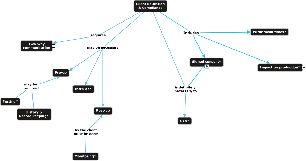 This Concept Map, created with IHMC CmapTools, has information related to: Client E&C, Client Education & Compliance Includes Withdrawal times*, Monitoring* by the client must be done Post-op, Client Education & Compliance Includes Signed consent*, Client Education & Compliance requires Two-way communication, Client informs Vet, Fasting* may be required Pre-op, Decreased meat production creates Economic disadvantage, Client Education & Compliance may be necessary Post-op, Decreased FCR creates Economic disadvantage, History & Record keeping* may be required Pre-op, Client Education & Compliance is definitely necessary to CYA*, Client Education & Compliance may be necessary Intra-op*, Client Education & Compliance Includes Impact on production*, Vet informs Client, Client Education & Compliance may be necessary Pre-op, Signed consent* is definitely necessary to CYA*
