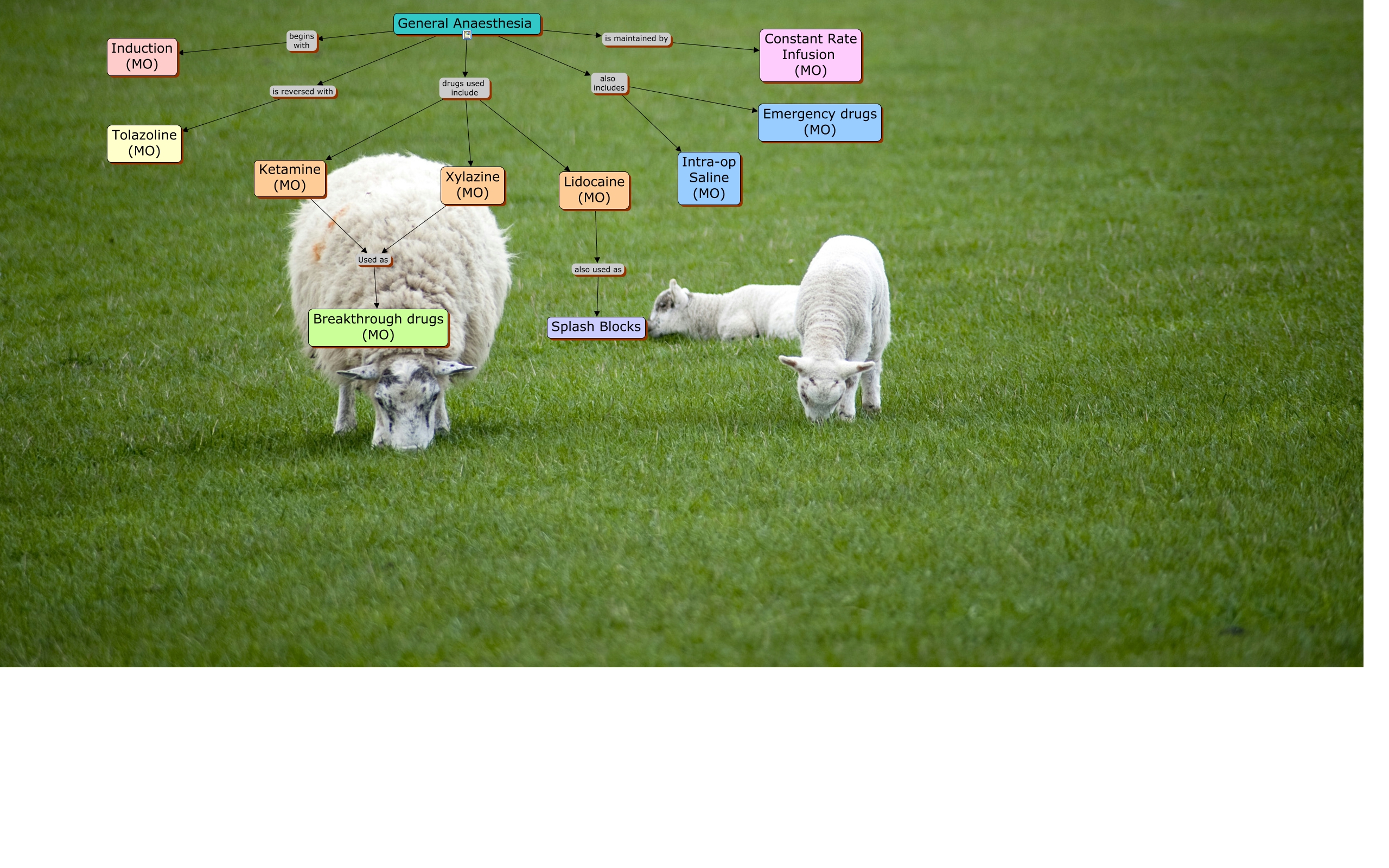 This Concept Map, created with IHMC CmapTools, has information related to: General Anaesthesia, General Anaesthesia drugs used include Ketamine (MO), General Anaesthesia drugs used include Lidocaine (MO), General Anaesthesia also includes Emergency drugs (MO), General Anaesthesia also includes Intra-op Saline (MO), Ketamine (MO) Used as Breakthrough drugs (MO), Xylazine (MO) Used as Breakthrough drugs (MO), General Anaesthesia drugs used include Xylazine (MO), General Anaesthesia is maintained by Constant Rate Infusion (MO), General Anaesthesia begins with Induction (MO), General Anaesthesia is reversed with Tolazoline (MO), Lidocaine (MO) also used as Splash Blocks