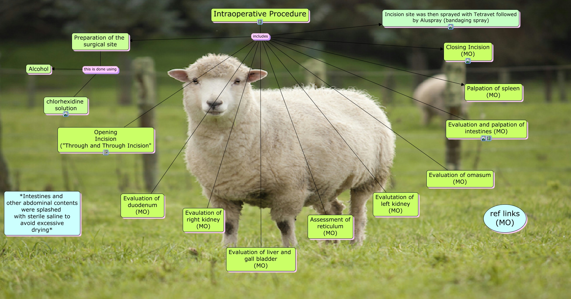 This Concept Map, created with IHMC CmapTools, has information related to: Intraoperative Procedure, Intraoperative Procedure includes Palpation of spleen (MO), Intraoperative Procedure includes Evalutation of left kidney (MO), Intraoperative Procedure includes Assessment of reticulum (MO), Intraoperative Procedure includes Evaluation of omasum (MO), Intraoperative Procedure includes Evaluation and palpation of intestines (MO), Preparation of the surgical site this is done using chlorhexidine solution, Intraoperative Procedure includes Opening Incision ("Through and Through Incision", Intraoperative Procedure includes Evaulation of right kidney (MO), Intraoperative Procedure includes Evaluation of duodenum (MO), Preparation of the surgical site this is done using Alcohol, Intraoperative Procedure includes Evaluation of liver and gall bladder (MO), Intraoperative Procedure includes Closing Incision (MO), Intraoperative Procedure includes Preparation of the surgical site, Intraoperative Procedure includes Incision site was then sprayed with Tetravet followed by Aluspray (bandaging spray)