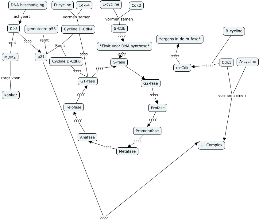 Deze Concept Map heeft informatie gerelateerd aan: Werkgroep 1A, S-fase G2-fase, Cdk-4 vormen samen Cycline D-Cdk4, Metafase ???? Anafase, p53 ???? p21, p21 Remt Cycline D-Cdk6, *Eiwit voor DNA synthese* ???? S-fase, p21 Remt Cycline D-Cdk4, E-cycline vormen samen S-Cdk, A-cycline vormen samen ...-Complex, B-cycline ???? m-Cdk, Cycline D-Cdk4 ???? G1-fase, Cdk2 vormen samen S-Cdk, DNA beschadiging activeert p53, S-Cdk ???? *Eiwit voor DNA synthese*, Anafase ???? Telofase, MDM2 remt p53, m-Cdk ???? *ergens in de m-fase*, MDM2 zorgt voor kanker, D-cycline vormen samen Cycline D-Cdk4, Cdk1 ???? m-Cdk