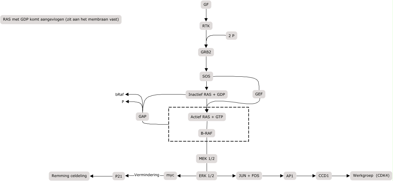 Deze Concept Map heeft informatie gerelateerd aan: Werkgroep 2A, GAP Inactief RAS + GDP, SOS Inactief RAS + GDP, ERK 1/2 myc, MEK 1/2 ERK 1/2, CCD1 Werkgroep (CDK4), RTK GRB2, ERK 1/2 JUN + FOS, GF RTK, B-RAF MEK 1/2, SOS GEF, GAP, GAP P, P21 Remming celdeling, 2 P GRB2, GEF Actief RAS + GTP, Actief RAS + GTP B-RAF, AP1 CCD1, JUN + FOS AP1, Inactief RAS + GDP Actief RAS + GTP, GRB2 SOS