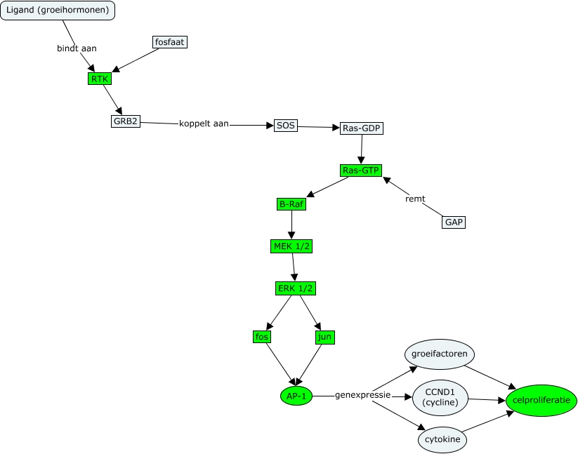 Deze Concept Map heeft informatie gerelateerd aan: Zonder titel, fos AP-1, GAP remt Ras-GTP, Ras-GTP B-Raf, fosfaat RTK, RTK GRB2, GRB2 koppelt aan SOS, B-Raf MEK 1/2, ERK 1/2 jun, AP-1 genexpressie cytokine, Ligand (groeihormonen) bindt aan RTK, ERK 1/2 fos, jun AP-1, cytokine celproliferatie, CCND1 (cycline) celproliferatie, AP-1 genexpressie CCND1 (cycline), groeifactoren celproliferatie, AP-1 genexpressie groeifactoren, Ras-GDP Ras-GTP, MEK 1/2 ERK 1/2, SOS Ras-GDP