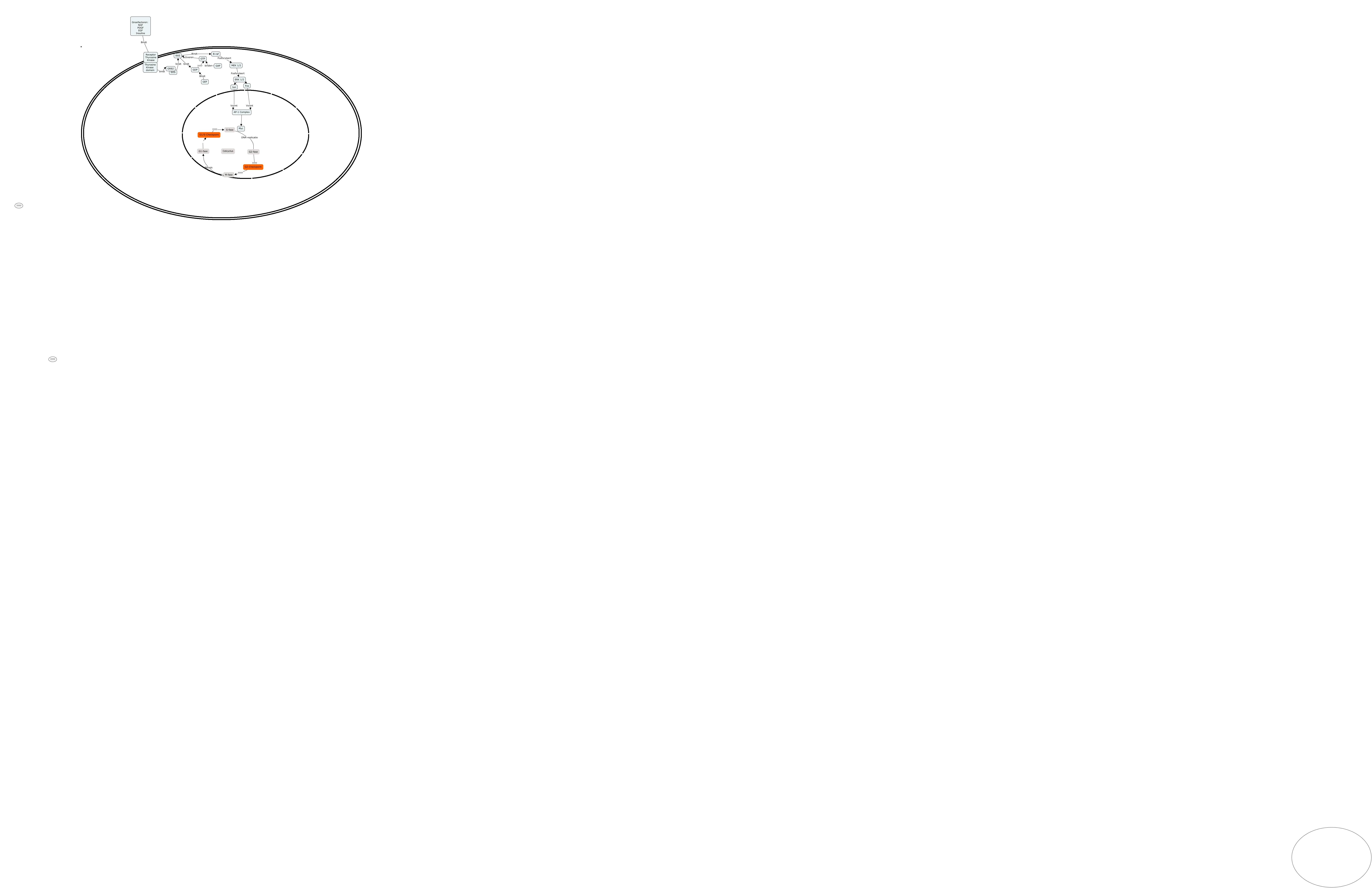 Deze Concept Map heeft informatie gerelateerd aan: Zonder titel, G1-fase G1/S-Checkpoint, B-raf Fosforyleert MEK 1/2, ERK 1/2 ???? Fos, Jun Vormt AP-1 Complex, GTP activeren RAS, GEF Bindt GDP, G2-Checkpoint ???? M-fase, AP-1 Complex ???? Myc, Thyrosine Kinase domein bindt GRB2, G2-fase ???? G2-Checkpoint, Fos Vormt AP-1 Complex, Groeifactoren: NGF PDGF EGF Insuline Bindt Receptor Thyrosine Kinase, M-fase Mitosis G1-fase, G1/S-Checkpoint ???? S-fase, RAS Bindt B-raf, MEK 1/2 Fosforyleert ERK 1/2, GAP binden GTP, GDP ???? GTP, RAS bindt GDP, SOS bindt RAS