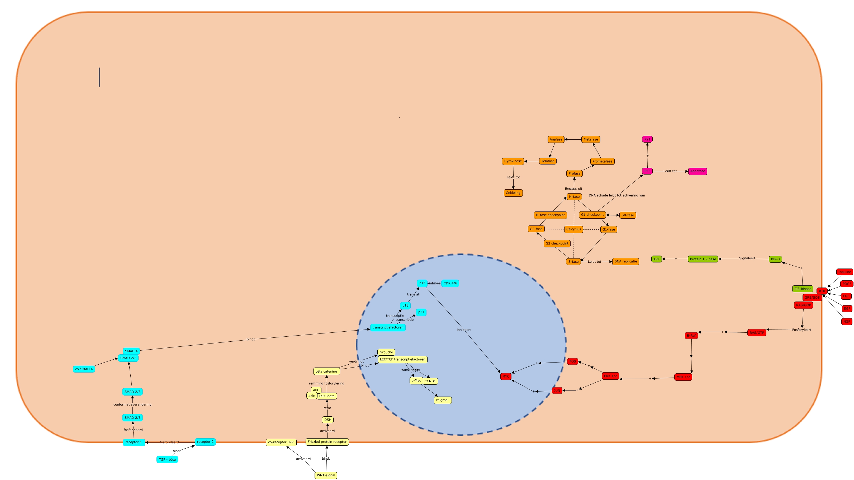 Deze Concept Map heeft informatie gerelateerd aan: cMAP, RAS/GTP + B-Raf, transcriptiefactoren transcriptie p15, RAS/GDP Fosforyleert RAS/GTP, PI3-kinase + PIP-3, FGF RTK, MEK 1/2 + ERK 1/2, Profase Prometafase, P53 Leidt tot Apoptose, bèta catenine bindt LEF/TCF transcriptiefactoren, p15 inhibeert MYC, Celcyclus G2-fase, PIP-3 Signaleert Protein 1 Kinase, bèta catenine verdringt Groucho, SMAD 2/3 conformatieverandering SMAD 2/3, ERK 1/2 + FOS, WNT-signal activeerd co-receptor LRP, transcriptiefactoren transcriptie p21, G0-fase G1 checkpoint, c-Myc celgroei, Telofase Cytokinese