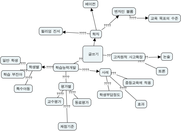 This Concept Map, created with IHMC CmapTools, has information related to: 1번, 사례 ???? 효과, 글쓰기 ???? 학자, 학자 ???? 벤자민 블룸, 학생별 ???? 일반 학생, 학습능력개발 ???? 학생별, 평가별 ???? 동료평가, 평가별 ???? 채점기준, 사례 ???? 중등교육에 적용, 학습능력개발 ???? 사례, 고차원적 사고확장 ???? 논술, 학생별 ???? 특수아동, 평가별 ???? 교수평가, 글쓰기 ???? 고차원적 사고확장, 벤자민 블룸 ???? 교육 목표의 수준, 글쓰기 ???? 학습능력개발, 고차원적 사고확장 ???? 토론, 사례 ???? 학생부담정도, 학생별 ???? 학습 부진아, 학자 ???? 베이컨, 학습능력개발 ???? 평가별