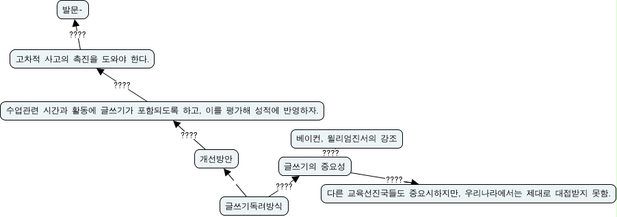 This Concept Map, created with IHMC CmapTools, has information related to: 3번, 글쓰기독려방식 ???? 글쓰기의 중요성, 개선방안 ???? 수업관련 시간과 활동에 글쓰기가 포함되도록 하고, 이를 평가해 성적에 반영하자., 글쓰기의 중요성 ???? 다른 교육선진국들도 중요시하지만, 우리나라에서는 제대로 대접받지 못함., 글쓰기의 중요성 ???? 베이컨, 윌리엄진서의 강조, 글쓰기의 중요성 ???? 다른 교육선진국들도 중요시하지만, 우리나라에서는 제대로 대접받지 못함., 고차적 사고의 촉진을 도와야 한다. ???? 발문-, 수업관련 시간과 활동에 글쓰기가 포함되도록 하고, 이를 평가해 성적에 반영하자. ???? 고차적 사고의 촉진을 도와야 한다., 글쓰기독려방식 개선방안