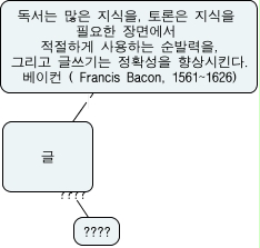 This Concept Map, created with IHMC CmapTools, has information related to: 4번, 글 ???? ????, 글 독서는 많은 지식을, 토론은 지식을 필요한 장면에서 적절하게 사용하는 순발력을, 그리고 글쓰기는 정확성을 향상시킨다. 베이컨 ( Francis Bacon, 1561~1626)