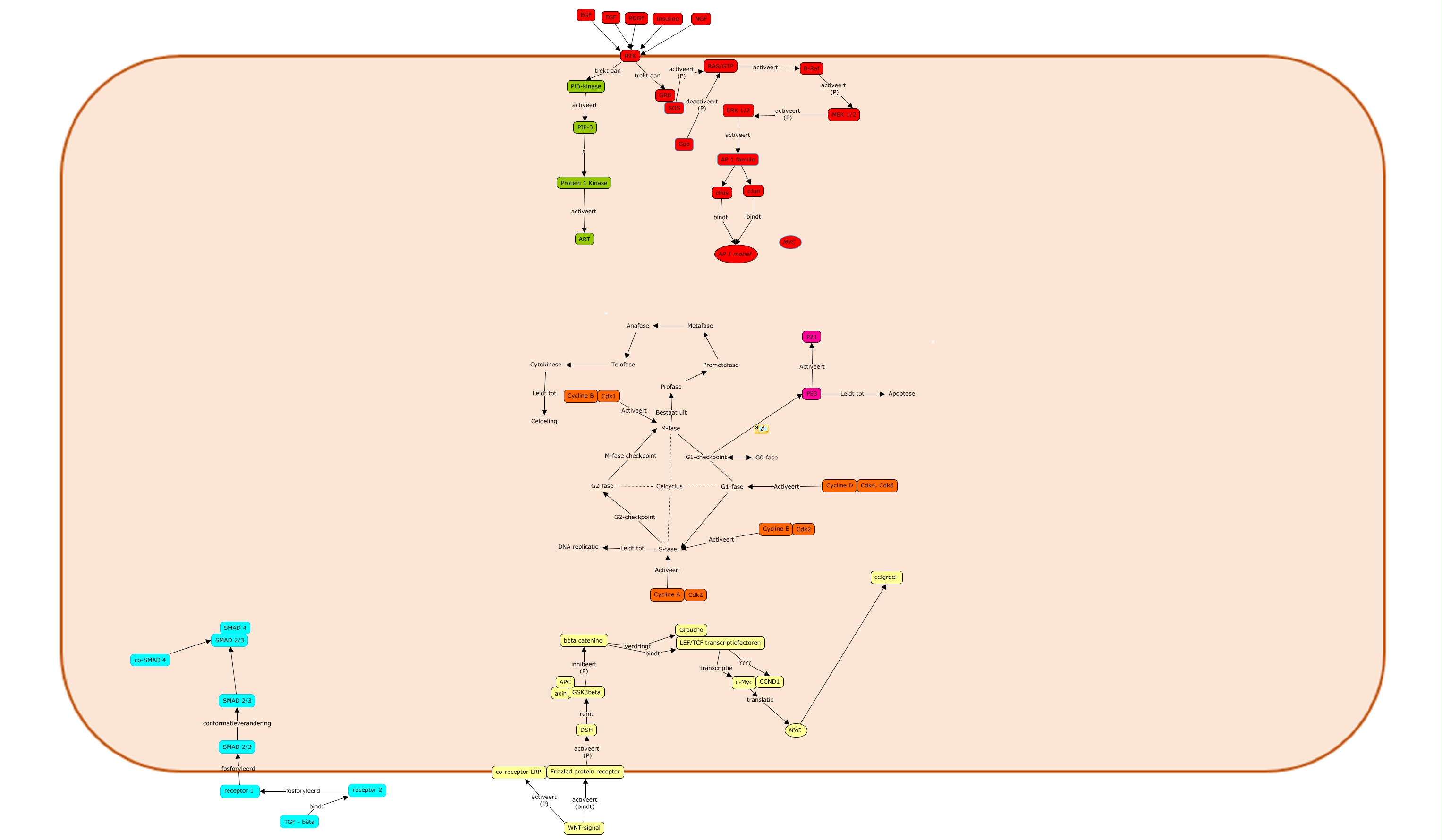 Deze Concept Map heeft informatie gerelateerd aan: Julia, P53 Leidt tot Apoptose, Metafase Anafase, Profase Prometafase, Anafase Telofase, RTK trekt aan PI3-kinase, PDGF RTK, bèta catenine verdringt Groucho, receptor 2 fosforyleerd receptor 1, SOS activeert (P) RAS/GTP, cJun bindt AP 1 motief, ERK 1/2 activeert AP 1 familie, c-Myc translatie MYC, Cdk1 Activeert M-fase, Cytokinese Leidt tot Celdeling, G2-fase M-fase checkpoint M-fase, Cycline E Activeert S-fase, EGF RTK, M-fase G1-checkpoint G0-fase, Celcyclus M-fase, LEF/TCF transcriptiefactoren transcriptie c-Myc