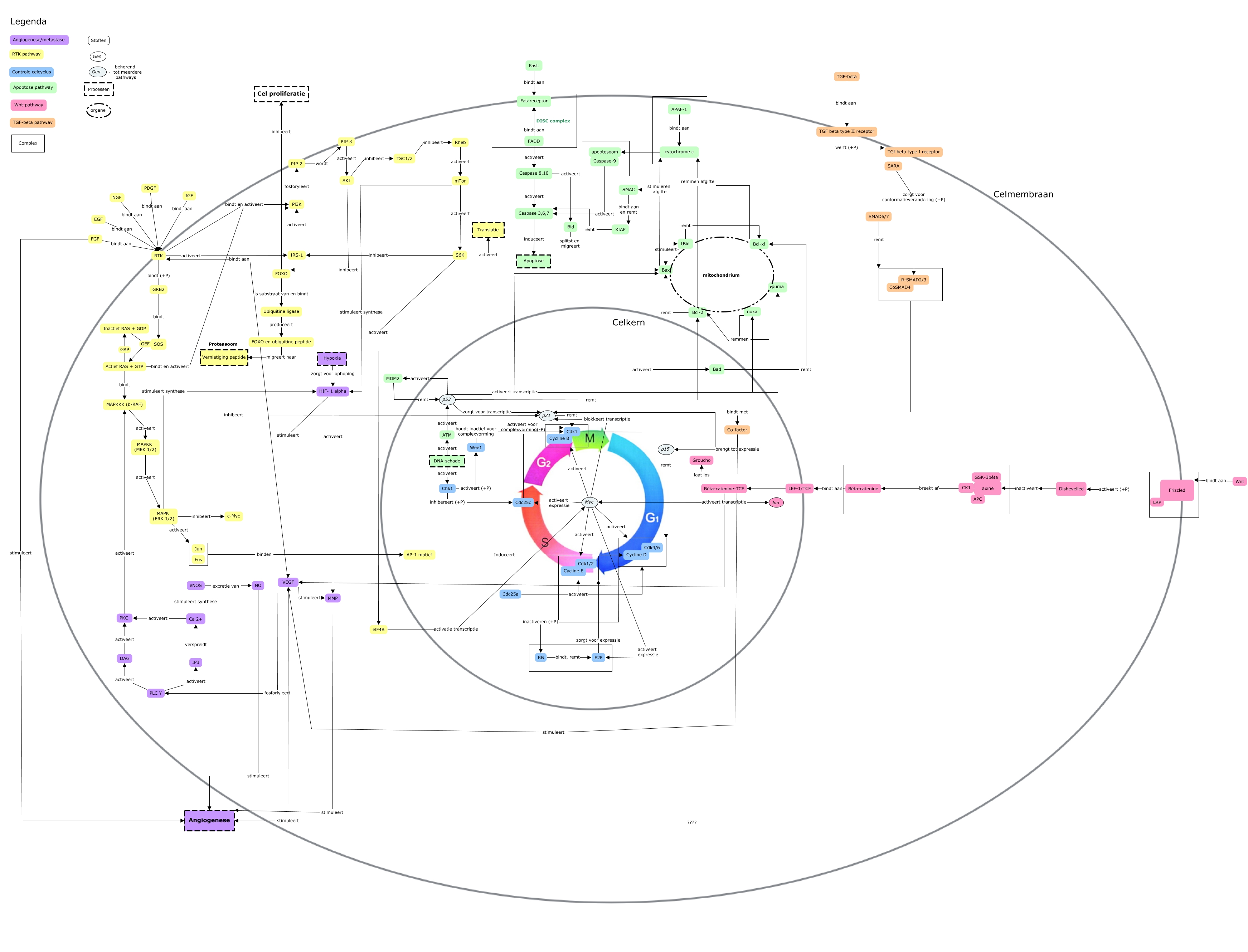 Deze Concept Map heeft informatie gerelateerd aan: ConceptMap, Caspase 8,10 activeert Caspase 3,6,7, RTK bindt en activeert Pl3K, S6K activeert elF4B, Cdk1 activeert Bad, binden AP-1 motief, AP-1 motief Induceert Cycline D, IGF bindt aan RTK, E2F zorgt voor expressie ????, Caspase 8,10 activeert Bid, ???? inactiveren (+P) RB, Dishevelled inactiveert axine, p15 remt ????, PDGF bindt aan RTK, Chk1 inhibereert (+P) Cdc25c, PIP 3 activeert AKT, HIF- 1 alpha activeert MMP, Co-factor brengt tot expressie p21, Bax stimuleren afgifte cytochrome c, Cdc25a activeert ????, FOXO is substraat van en bindt Ubiquitine ligase