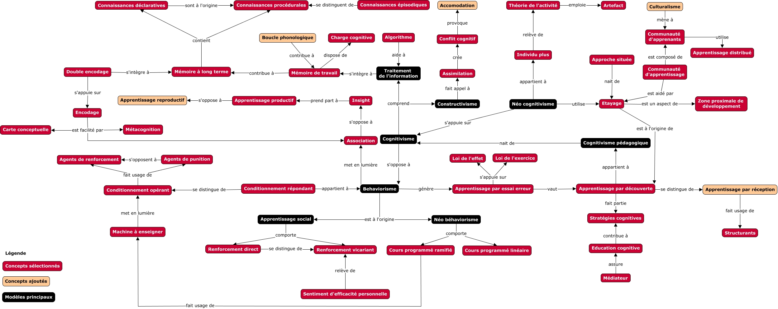Cette carte de concepts créée avec IHMC CmapTools traite de: Carte collaborative, Algorithme aide à Traitement de l'information, Sentiment d'efficacité personnelle relève de Renforcement vicariant, Approche située nait de Etayage, Apprentissage social comporte Renforcement vicariant, Apprentissage par essai erreur vaut Apprentissage par découverte, Behaviorisme est à l'origine Néo béhaviorisme, Mémoire à long terme contient Connaissances déclaratives, Communauté d'apprentissage est aidé par Etayage, Mémoire de travail dispose de Charge cognitive, Communauté d'apprenants utilise Apprentissage distribué, Conditionnement opérant fait usage de Agents de renforcement, Cognitivisme s'oppose à Behaviorisme, Conditionnement répondant appartient à Behaviorisme, Double encodage s'intègre à Mémoire à long terme, Médiateur assure Education cognitive, Mémoire de travail contribue à Mémoire à long terme, Etayage est à l'origine de Apprentissage par découverte, Conditionnement répondant se distingue de Conditionnement opérant, Apprentissage par essai erreur s'appuie sur Loi de l'effet, Encodage est facilité par Carte conceptuelle