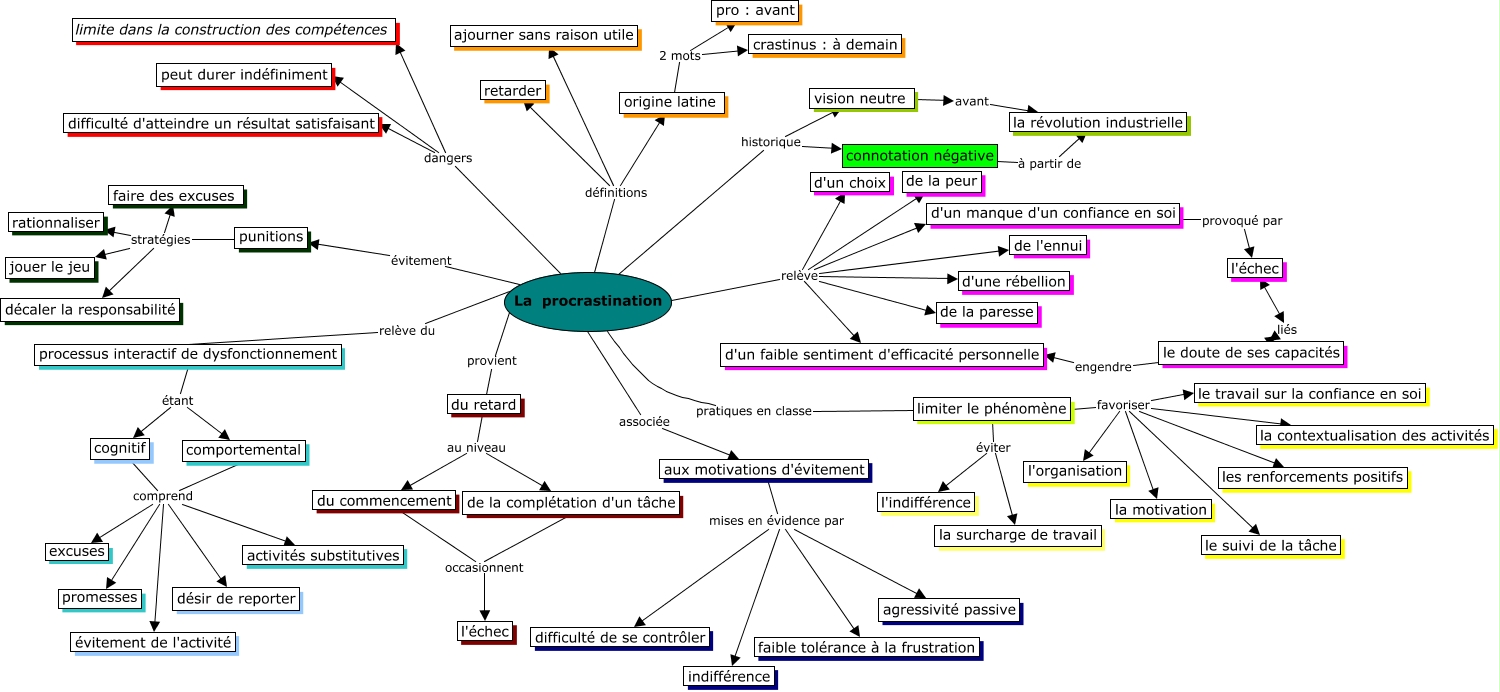 Cette carte de concepts créée avec IHMC CmapTools traite de: Didactique, du commencement occasionnent l'échec, cognitif comprend promesses, origine latine 2 mots crastinus : à demain, La procrastination évitement punitions, limiter le phénomène favoriser le suivi de la tâche, La procrastination définitions origine latine, origine latine 2 mots pro : avant, du retard au niveau de la complétation d'un tâche, du commencement occasionnent de la complétation d'un tâche, La procrastination dangers peut durer indéfiniment, punitions stratégies faire des excuses, punitions stratégies jouer le jeu, La procrastination relève d'une rébellion, limiter le phénomène favoriser la contextualisation des activités, aux motivations d'évitement mises en évidence par agressivité passive, La procrastination relève d'un faible sentiment d'efficacité personnelle, limiter le phénomène favoriser la motivation, cognitif comprend évitement de l'activité, cognitif comprend activités substitutives, punitions stratégies décaler la responsabilité