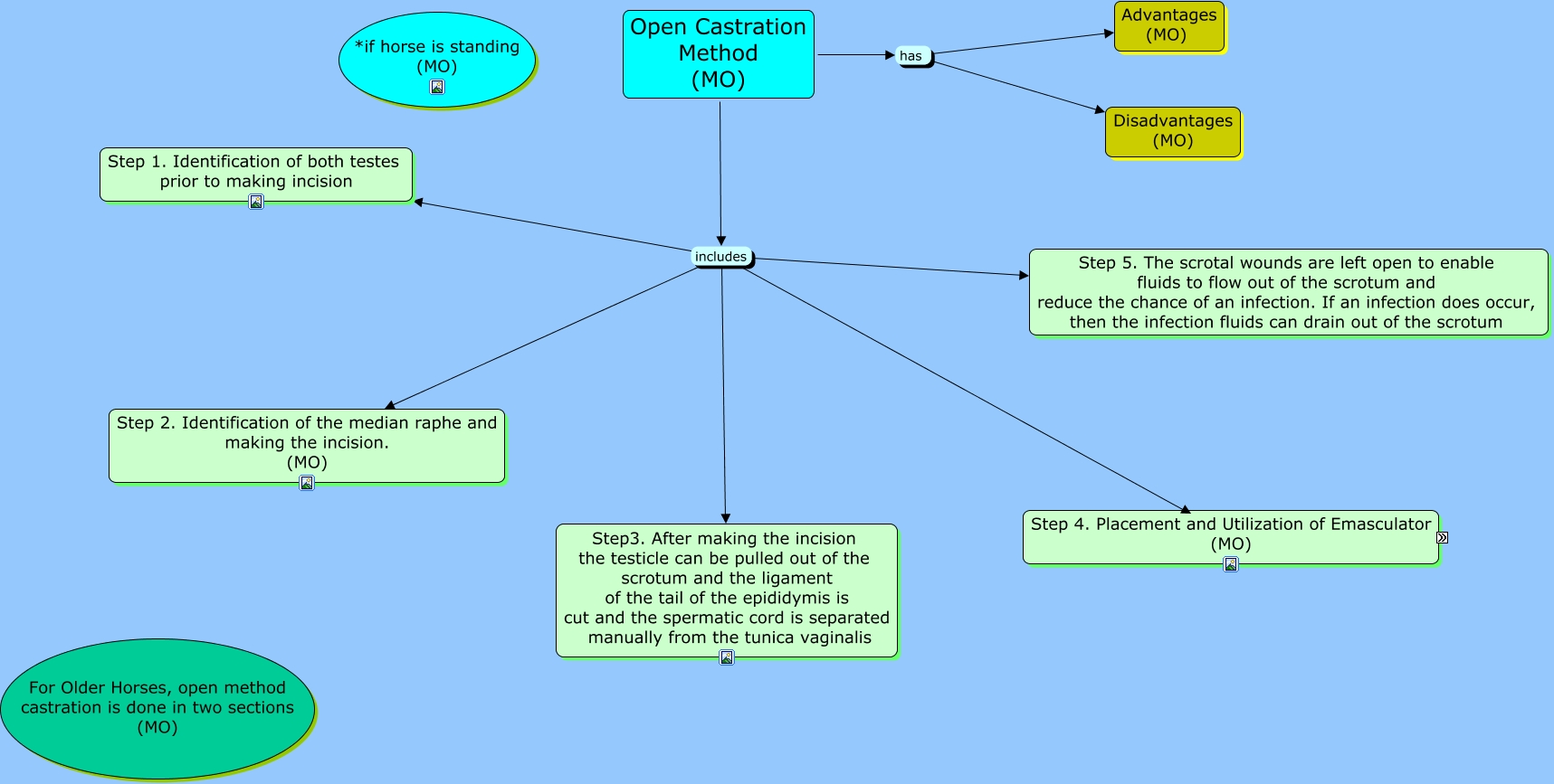 This Concept Map, created with IHMC CmapTools, has information related to: Open Castration Method, Step 4. Placement and utilization of the Emasculator which further entails that 2. Partially close the jaws of the emasculator and then only close until the emasculators “grab the cord�? and make a crunching sound, Step 4. Placement and utilization of the Emasculator which further entails that 3. All tension on the testis is released (put the testis down) and both hands on the handles of the emasculators are placed and then closed completely in one smooth crush maintaining the position of the emasculators parallel to the body and perpendicular to the cord. (MO), Open Castration Method (MO) has Advantages (MO), Open Castration Method (MO) includes Step 4. Placement and utilization of the Emasculator, Open Castration Method (MO) includes Step 5. The scrotal wounds are left open to enable fluids to flow out of the scrotum and reduce the chance of an infection. If an infection does occur, then the infection fluids can drain out of the scrotum, Open Castration Method (MO) includes Step 2. Identification of the median raphe and making the incision. (MO), Open Castration Method (MO) has Disadvantages (MO), Step 4. Placement and utilization of the Emasculator which further entails that 1. Emasculator jaws are opened and are placed around cord transversally as proximally as possible – “Nut to nut�? (the emasculator’s wing nut is oriented to point towards the testis) (MO), Open Castration Method (MO) includes Step3. After making the incision the testicle can be pulled out of the scrotum and the ligament of the tail of the epididymis is cut and the spermatic cord is separated manually from the tunica vaginalis, Open Castration Method (MO) includes Step 1. Identification of both testes prior to making incision