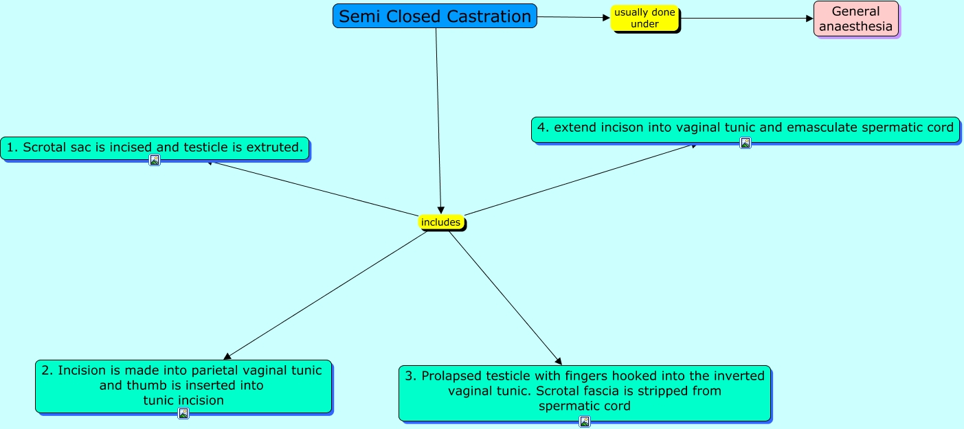 This Concept Map, created with IHMC CmapTools, has information related to: semi closed castration, Semi Closed Castration usually done under General anaesthesia, Semi Closed Castration includes 1. Scrotal sac is incised and testicle is extruted., Semi Closed Castration includes 4. extend incison into vaginal tunic and emasculate spermatic cord, Semi Closed Castration includes 3. Prolapsed testicle with fingers hooked into the inverted vaginal tunic. Scrotal fascia is stripped from spermatic cord, Semi Closed Castration includes 2. Incision is made into parietal vaginal tunic and thumb is inserted into tunic incision