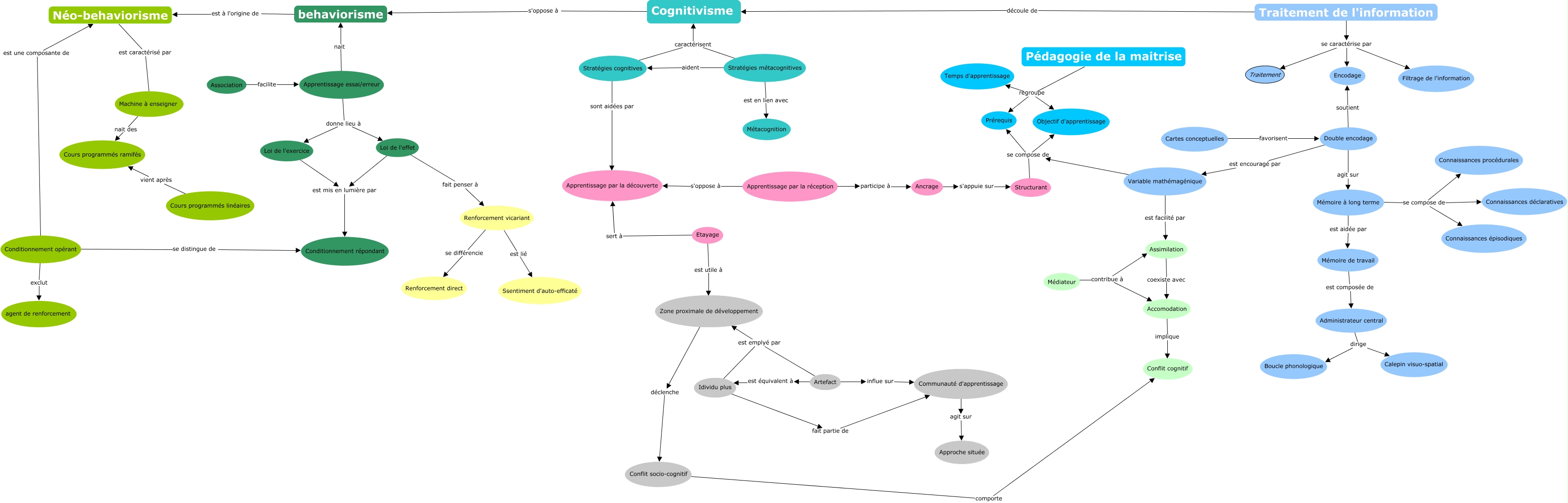 Cette carte de concepts créée avec IHMC CmapTools traite de: CmapCollaborativeGM25, Double encodage est encouragé par Variable mathémagénique, Cours programmés linéaires vient après Cours programmés ramifés, Loi de l'exercice est mis en lumière par Conditionnement répondant, Variable mathémagénique se compose de Objectif d'apprentissage, Apprentissage essai/erreur donne lieu à Loi de l'effet, Ancrage s'appuie sur Structurant, Mémoire à long terme se compose de Connaissances déclaratives, Administrateur central dirige Boucle phonologique, Stratégies métacognitives est en lien avec Métacognition, Administrateur central dirige Calepin visuo-spatial, Loi de l'effet est mis en lumière par Conditionnement répondant, Traitement de l'information se caractérise par Encodage, Apprentissage essai/erreur donne lieu à Loi de l'exercice, Mémoire à long terme se compose de Connaissances épisodiques, Idividu plus est emplyé par Artefact, Accomodation implique Conflit cognitif, Apprentissage par la réception s'oppose à Apprentissage par la découverte, Cognitivisme s'oppose à behaviorisme, Mémoire à long terme est aidée par Mémoire de travail, Etayage est utile à Zone proximale de développement