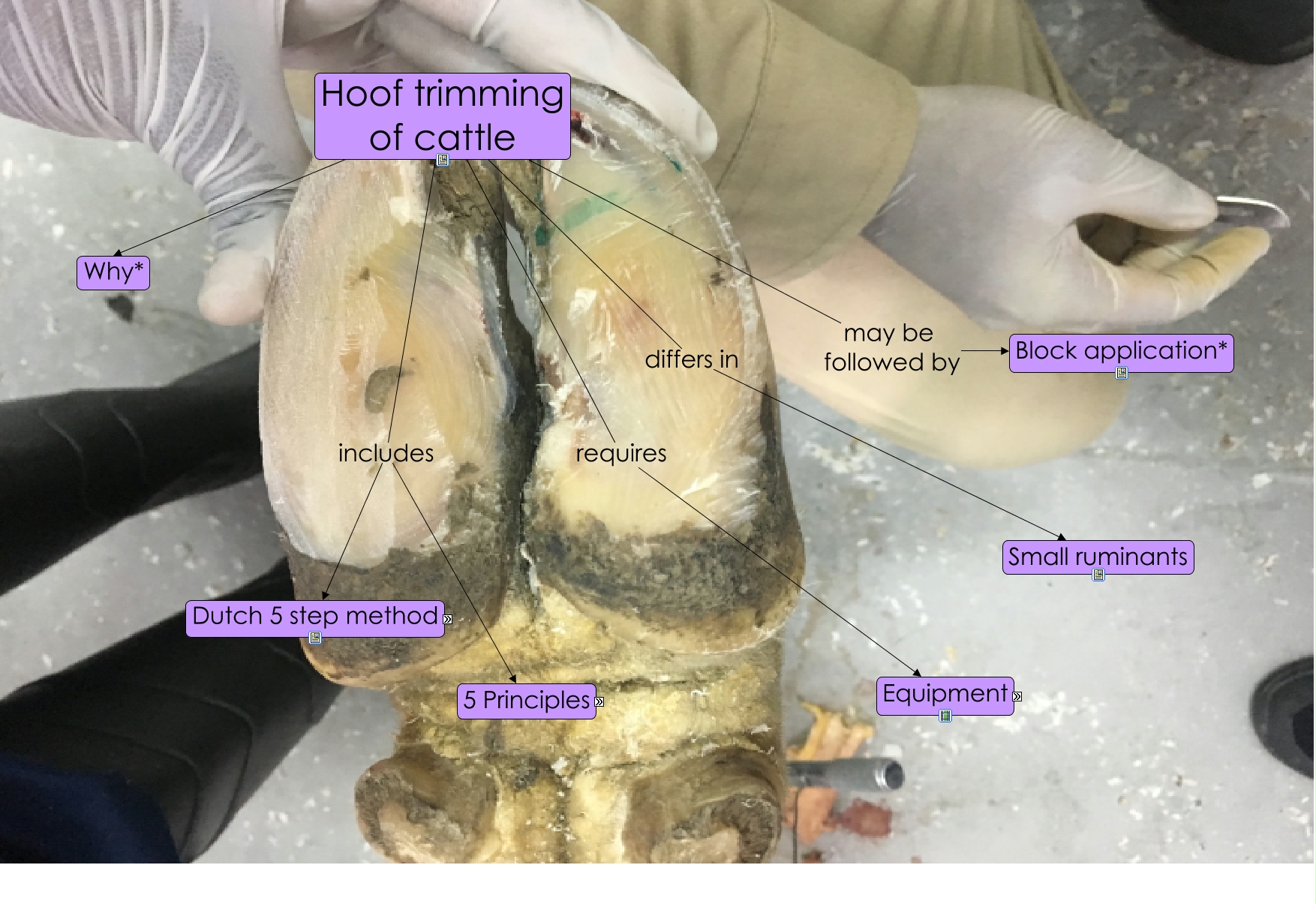 This Concept Map, created with IHMC CmapTools, has information related to: Hoof trimming, 3. Dish soles (Modeling) corrective trimming required? 4. Relieve weight off painful claw, Hoof trimming of cattle includes Dutch 5 step method, 2. Match untrimmed claw to this 3. Dish soles (Modeling), Hoof trimming of cattle Why*, Hoof trimming of cattle requires Equipment, Hoof trimming of cattle may be followed by Block application*, Hoof trimming of cattle includes 5 Principles, 1. Trim toe length to 7.5 cm/ 3 inches* 2. Match untrimmed claw to this, 4. Relieve weight off painful claw 5. Remove loose/underrun horn & hard ridges, Hoof trimming of cattle differs in Small ruminants