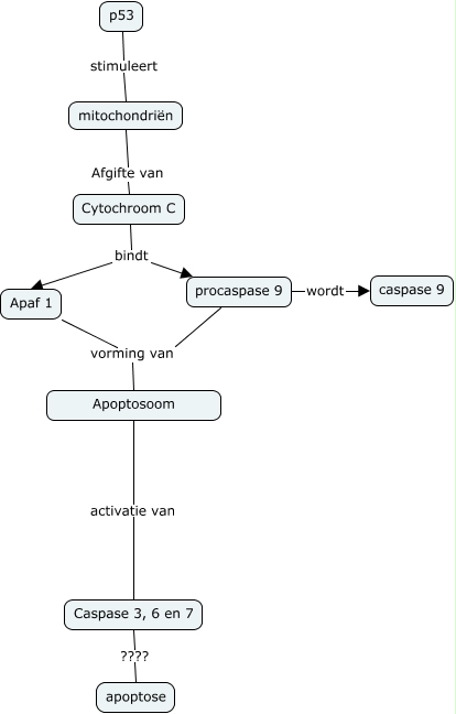 Deze Concept Map heeft informatie gerelateerd aan: werkgroep 3A, Apoptosoom activatie van Caspase 3, 6 en 7, p53 stimuleert mitochondriën, Cytochroom C bindt Apaf 1, Cytochroom C bindt procaspase 9, procaspase 9 wordt caspase 9, Apaf 1 vorming van Apoptosoom, mitochondriën Afgifte van Cytochroom C, procaspase 9 vorming van Apoptosoom, Caspase 3, 6 en 7 ???? apoptose