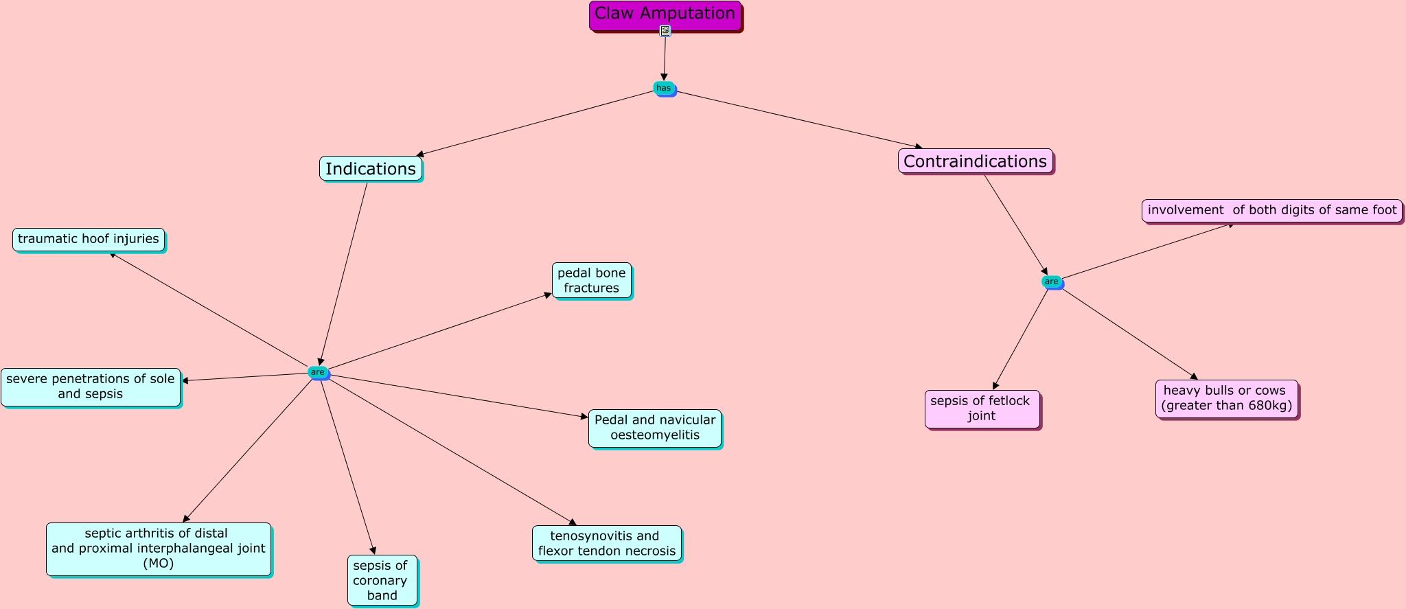 This Concept Map, created with IHMC CmapTools, has information related to: Indications and Contrainidications for claw amputation, Indications are Pedal and navicular oesteomyelitis, Indications are pedal bone fractures, Claw Amputation has Indications, Indications are severe penetrations of sole and sepsis, Claw Amputation has Contraindications, Indications are sepsis of coronary band, Contraindications are sepsis of fetlock joint, Contraindications are heavy bulls or cows (greater than 680kg), Indications are septic arthritis of distal and proximal interphalangeal joint (MO), Contraindications are involvement of both digits of same foot, Indications are tenosynovitis and flexor tendon necrosis, Indications are traumatic hoof injuries