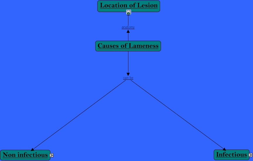 This Concept Map, created with IHMC CmapTools, has information related to: Causes of lameness, Causes of Lameness can be Non Infectious, Laminitis can lead to Sole ulcers, Non Infectious are Wall cracks and Fissures, Non Infectious are Sole ulcers, Non Infectious are White line lesions, Infectious such as Foot rot, Traumatic injury such as Puncture wounds *, Infectious such as Septic arthritis, Infectious such as Heel erosion, Non Infectious are Laminitis, Non Infectious are Traumatic injury, Infectious such as Digital dermatitis, Causes of Lameness anatomy Location of Lesion, Infectious such as Interdigital dermatitis, Causes of Lameness can be Infectious, Traumatic injury such as Fractures, Non Infectious are Interdigital Fibroma, Traumatic injury such as Lacerations