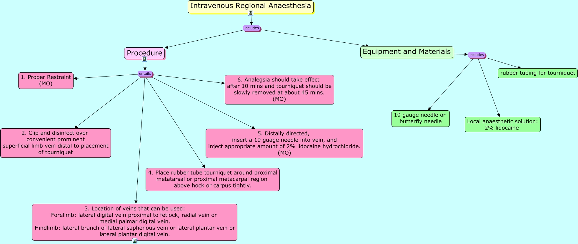 This Concept Map, created with IHMC CmapTools, has information related to: IVRA, Procedure entails 2. Clip and disinfect over convenient prominent superficial limb vein distal to placement of tourniquet, Equipment and Materials includes rubber tubing for tourniquet, Procedure entails 5. Distally directed, insert a 19 guage needle into vein, and inject appropriate amount of 2% lidocaine hydrochloride. (MO), Equipment and Materials includes 19 gauge needle or butterfly needle, Intravenous Regional Anaesthesia includes Equipment and Materials, Procedure entails 3. Location of veins that can be used: Forelimb: lateral digital vein proximal to fetlock, radial vein or medial palmar digital vein. Hindlimb: lateral branch of lateral saphenous vein or lateral plantar vein or lateral plantar digital vein., Equipment and Materials includes Local anaesthetic solution: 2% lidocaine, Procedure entails 1. Proper Restraint (MO), Intravenous Regional Anaesthesia includes Procedure, Procedure entails 4. Place rubber tube tourniquet around proximal metatarsal or proximal metacarpal region above hock or carpus tightly., Procedure entails 6. Analegsia should take effect after 10 mins and tourniquet should be slowly removed at about 45 mins. (MO)