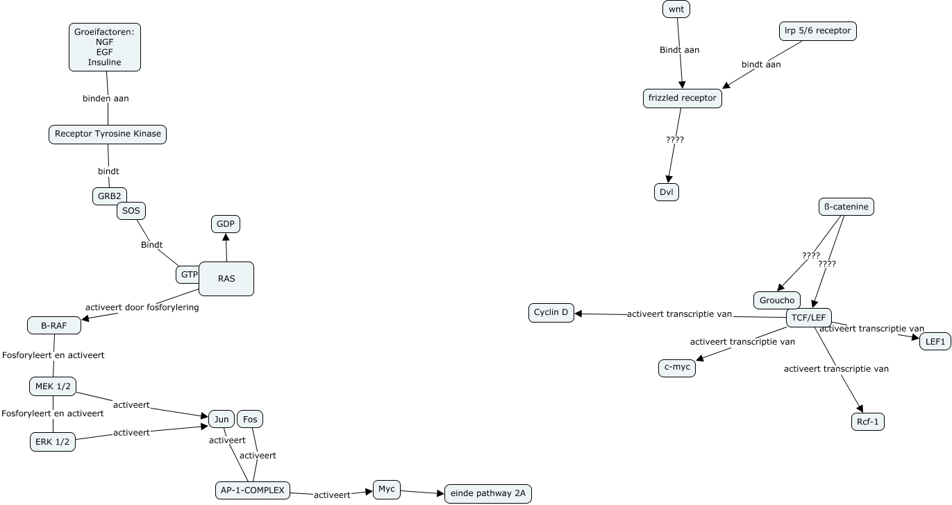 Deze Concept Map heeft informatie gerelateerd aan: cmappp, SOS Bindt GTP, ERK 1/2 activeert Jun, RAS GDP, frizzled receptor ???? Dvl, Groeifactoren: NGF EGF Insuline binden aan Receptor Tyrosine Kinase, MEK 1/2 activeert Jun, Fos activeert AP-1-COMPLEX, wnt Bindt aan frizzled receptor, TCF/LEF activeert transcriptie van c-myc, Myc einde pathway 2A, TCF/LEF activeert transcriptie van Cyclin D, lrp 5/6 receptor bindt aan frizzled receptor, AP-1-COMPLEX activeert Myc, B-RAF Fosforyleert en activeert MEK 1/2, Receptor Tyrosine Kinase bindt GRB2, MEK 1/2 Fosforyleert en activeert ERK 1/2, RAS activeert door fosforylering B-RAF, ß-catenine ???? Groucho, TCF/LEF activeert transcriptie van Rcf-1, TCF/LEF activeert transcriptie van LEF1