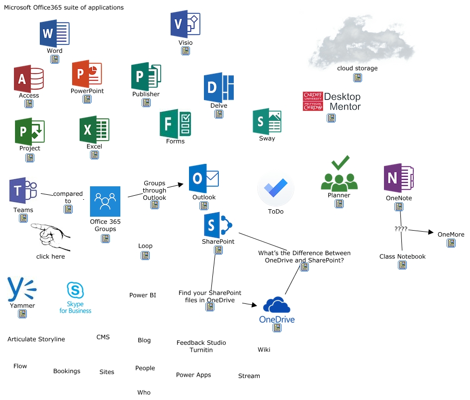 This Concept Map, created with IHMC CmapTools, has information related to: Office 365, SharePoint Find your SharePoint files in OneDrive, Office 365 Groups Groups through Outlook Outlook, OneNote ???? OneMore, Teams compared to Office 365 Groups, OneNote ???? Class Notebook, SharePoint What’s the Difference Between OneDrive and SharePoint?