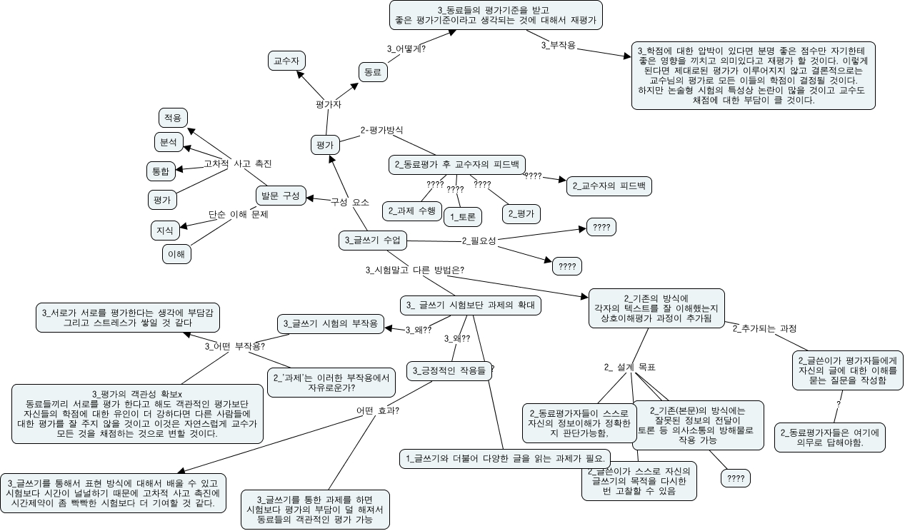 This Concept Map, created with IHMC CmapTools, has information related to: 2번, 2_기존의 방식에 각자의 텍스트를 잘 이해했는지 상호이해평가 과정이 추가됨 2_ 설계 목표 2_글쓴이가 스스로 자신의 글쓰기의 목적을 다시한 번 고찰할 수 있음, 2_동료평가 후 교수자의 피드백 ???? 1_토론, 3_글쓰기 시험의 부작용 3_어떤 부작용? 3_서로가 서로를 평가한다는 생각에 부담감 그리고 스트레스가 쌓일 것 같다, 발문 구성 고차적 사고 촉진 통합, 2_동료평가 후 교수자의 피드백 ???? 2_과제 수행, 3_긍정적인 작용들 어떤 효과? 3_글쓰기를 통해서 표현 방식에 대해서 배울 수 있고 시험보다 시간이 널널하기 때문에 고차적 사고 촉진에 시간제약이 좀 빡빡한 시험보다 더 기여할 것 같다., 2_동료평가 후 교수자의 피드백 ???? 2_교수자의 피드백, 2_글쓴이가 평가자들에게 자신의 글에 대한 이해를 묻는 질문을 작성함 ? 2_동료평가자들은 여기에 의무로 답해야함., 3_글쓰기 수업 구성 요소 평가, 동료 3_어떻게? 3_동료들의 평가기준을 받고 좋은 평가기준이라고 생각되는 것에 대해서 재평가, 평가 2-평가방식 2_동료평가 후 교수자의 피드백, 평가 평가자 교수자, 3_글쓰기 수업 2_필요성 ????, 발문 구성 고차적 사고 촉진 분석, 발문 구성 단순 이해 문제 지식, 2_기존의 방식에 각자의 텍스트를 잘 이해했는지 상호이해평가 과정이 추가됨 2_ 설계 목표 2_기존(본문)의 방식에는 잘못된 정보의 전달이 토론 등 의사소통의 방해물로 작용 가능, 2_기존의 방식에 각자의 텍스트를 잘 이해했는지 상호이해평가 과정이 추가됨 2_ 설계 목표 2_동료평가자들이 스스로 자신의 정보이해가 정확한 지 판단가능함,, 3_글쓰기 수업 3_시험말고 다른 방법은? 3_ 글쓰기 시험보단 과제의 확대, 평가 평가자 동료, 3_글쓰기 수업 3_시험말고 다른 방법은? 2_기존의 방식에 각자의 텍스트를 잘 이해했는지 상호이해평가 과정이 추가됨