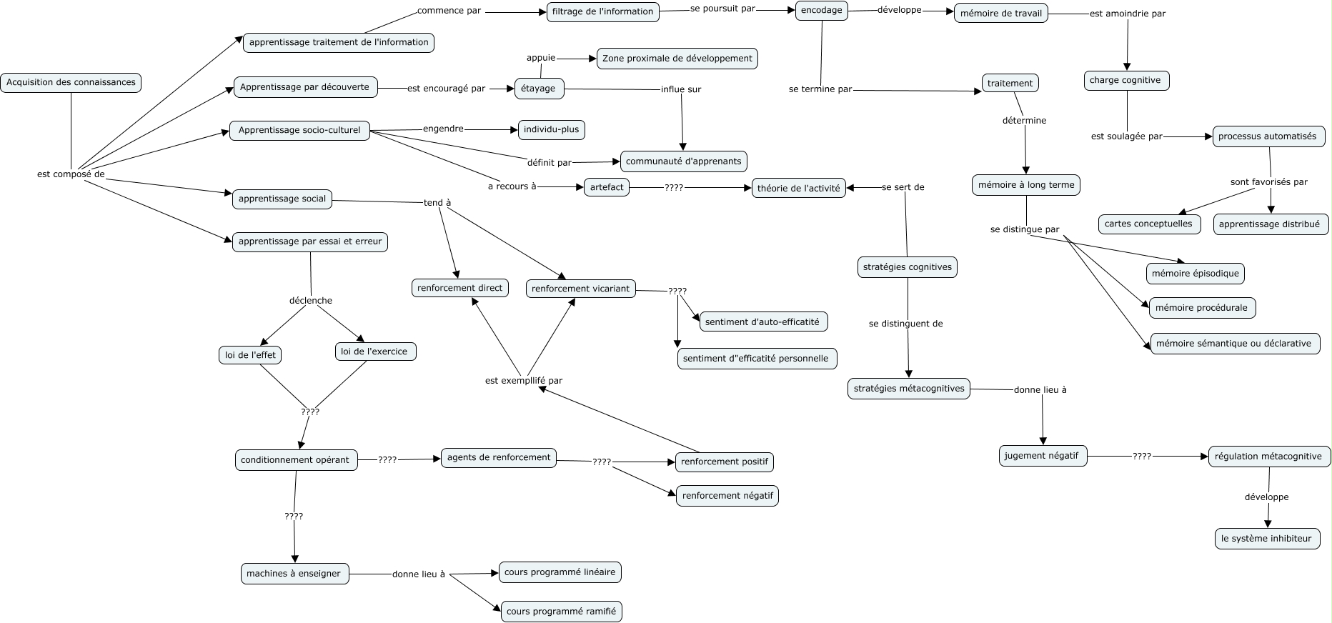 Cette carte de concepts créée avec IHMC CmapTools traite de: Cmap collective, mémoire à long terme se distingue par mémoire sémantique ou déclarative, charge cognitive est soulagée par processus automatisés, processus automatisés sont favorisés par apprentissage distribué, renforcement vicariant ???? sentiment d'auto-efficatité, Apprentissage socio-culturel engendre individu-plus, renforcement positif est exempllifé par renforcement vicariant, conditionnement opérant ???? machines à enseigner, traitement détermine mémoire à long terme, apprentissage social tend à renforcement direct, jugement négatif ???? régulation métacognitive, conditionnement opérant ???? agents de renforcement, loi de l'effet ???? conditionnement opérant, Acquisition des connaissances est composé de apprentissage par essai et erreur, stratégies métacognitives donne lieu à jugement négatif, apprentissage social tend à renforcement vicariant, stratégies cognitives se sert de théorie de l'activité, Apprentissage socio-culturel définit par communauté d'apprenants, étayage appuie Zone proximale de développement, mémoire de travail est amoindrie par charge cognitive, régulation métacognitive développe le système inhibiteur