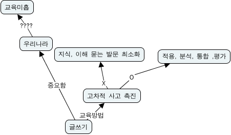 This Concept Map, created with IHMC CmapTools, has information related to: 2번, 우리나라 ???? 교육미흡, 고차적 사고 촉진 X 지식, 이해 묻는 발문 최소화, 글쓰기 중요함 우리나라, 고차적 사고 촉진 O 적용, 분석, 통합 ,평가, 글쓰기 교육방법 고차적 사고 촉진