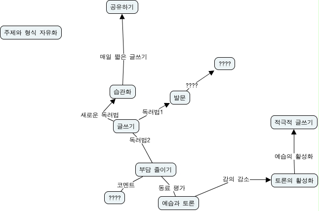 This Concept Map, created with IHMC CmapTools, has information related to: 원래3번, 예습과 토론 강의 감소 토론의 활성화, 부담 줄이기 동료 평가 예습과 토론, 글쓰기 독려법2 부담 줄이기, 발문 ???? ????, 토론의 활성화 예습의 활성화 적극적 글쓰기, 글쓰기 새로운 독려법 습관화, 부담 줄이기 코멘트 ????, 글쓰기 독려법1 발문, 습관화 매일 짧은 글쓰기 공유하기