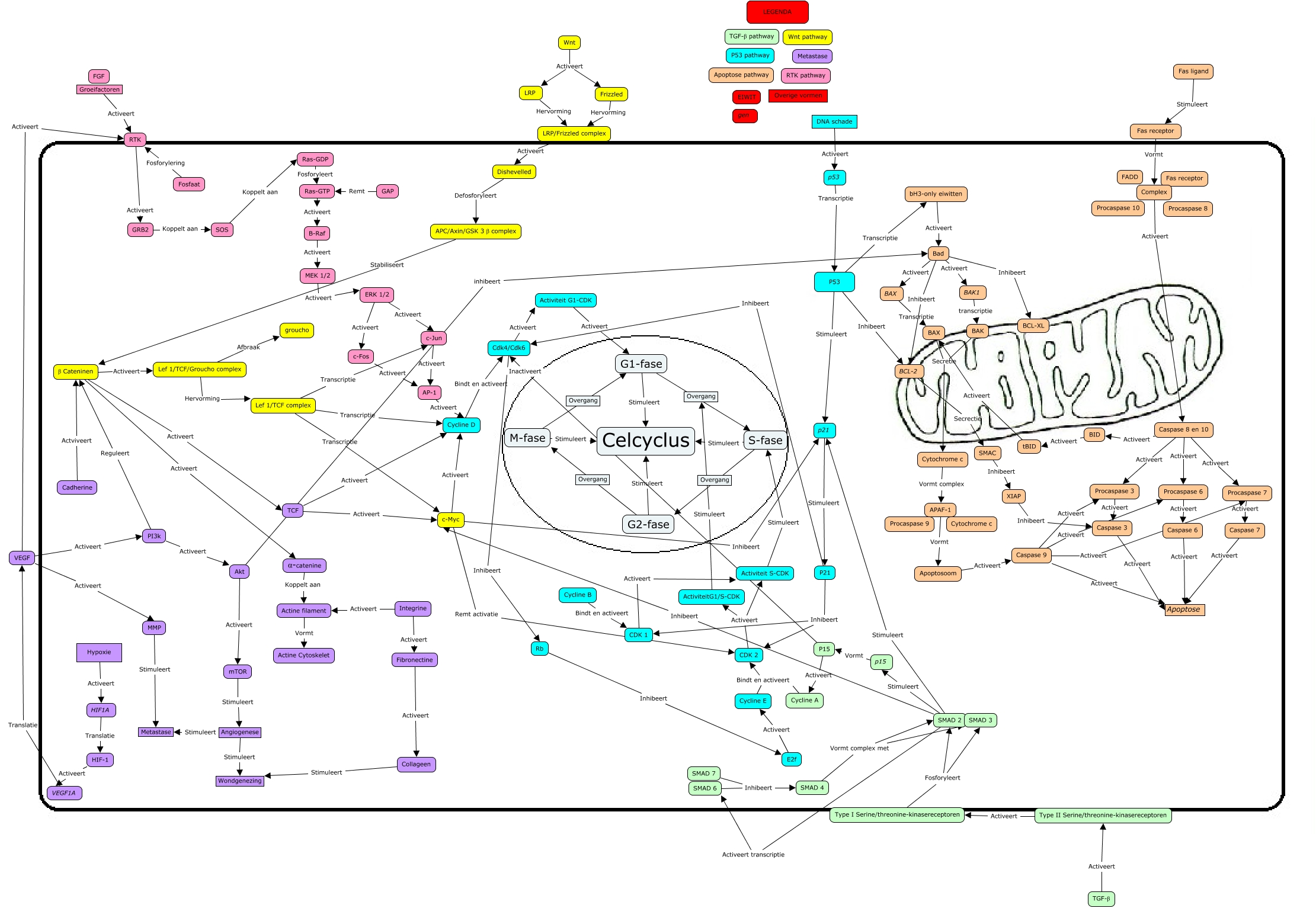 Deze Concept Map heeft informatie gerelateerd aan: Cmap concept 3, BAK Secretie Cytochrome c, p15 Vormt P15, Type I Serine/threonine-kinasereceptoren Fosforyleert SMAD 3, Lef 1/TCF complex Transcriptie Cycline D, Bad Inhibeert BCL-XL, Ras-GDP Fosforyleert Ras-GTP, bH3-only eiwitten Activeert Bad, GRB2 Koppelt aan SOS, α-catenine Koppelt aan Actine filament, RTK Activeert GRB2, Angiogenese Stimuleert Wondgenezing, DNA schade Activeert p53, Collageen Stimuleert Wondgenezing, BAX Transcriptie BAX, AP-1 Activeert Cycline D, Integrine Activeert Fibronectine, CDK 1 Activeert Activiteit S-CDK, E2f Activeert Cycline E, β Cateninen Activeert TCF, Angiogenese Stimuleert Metastase